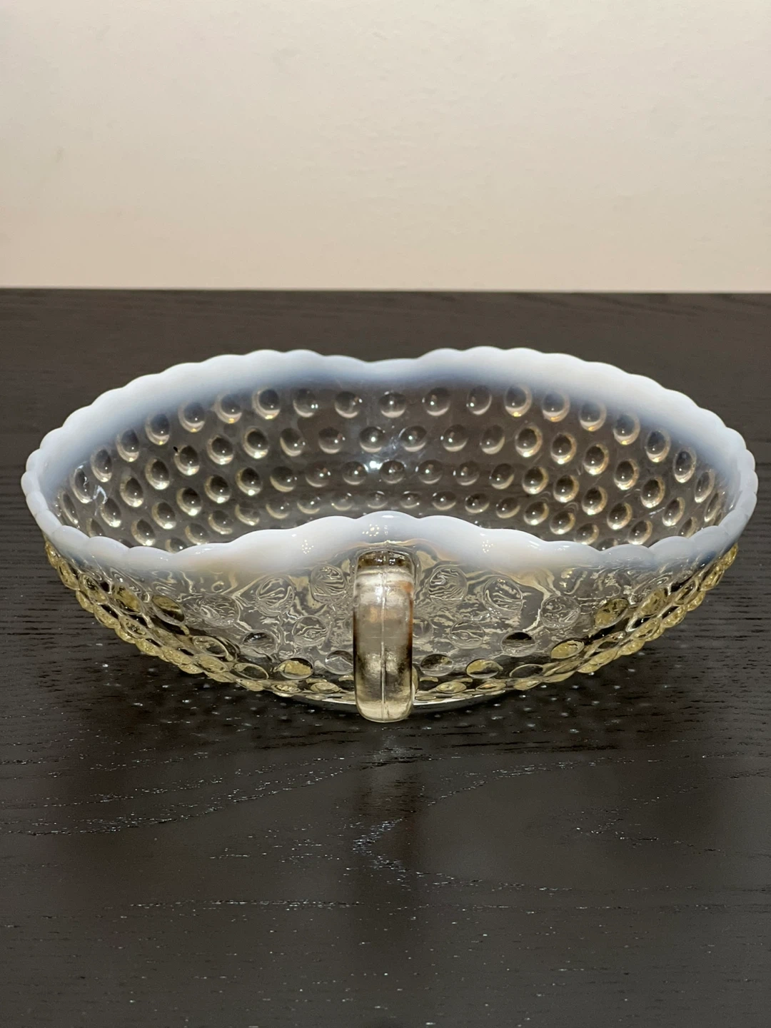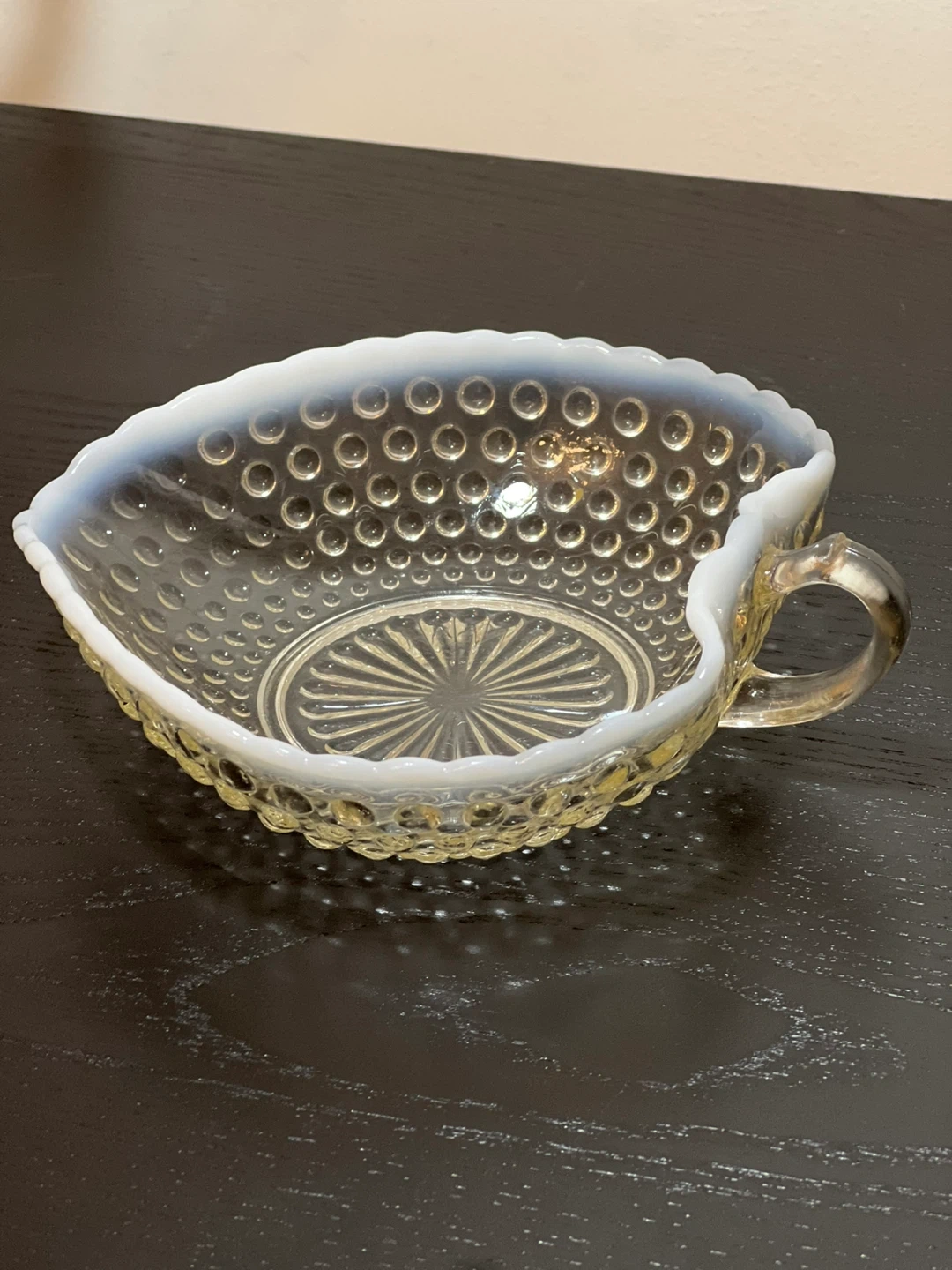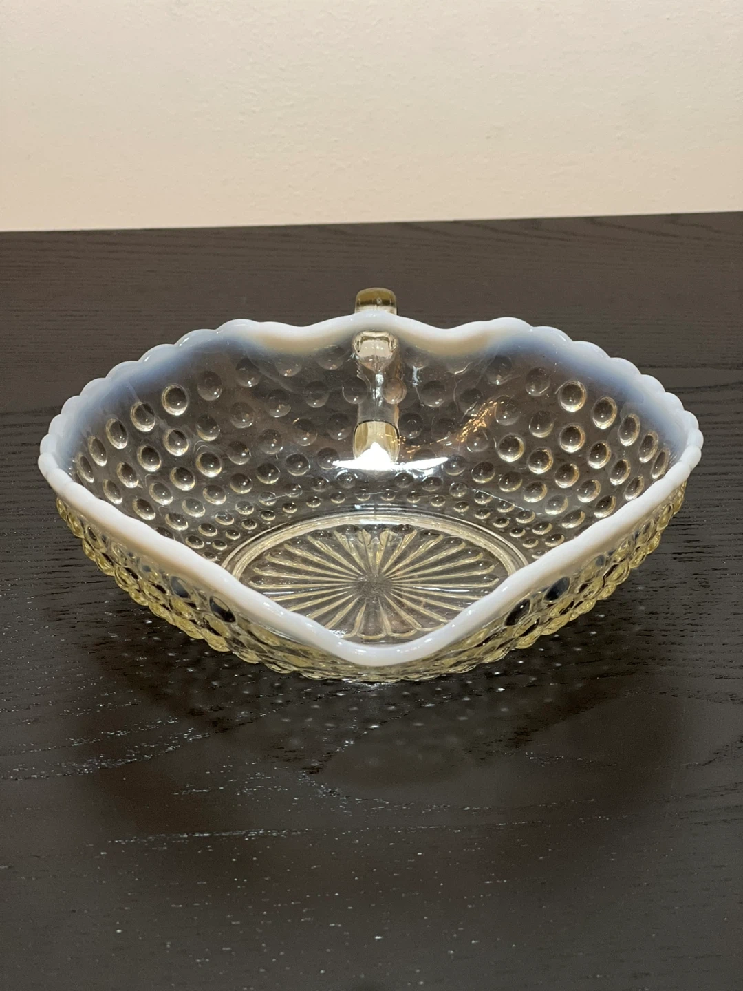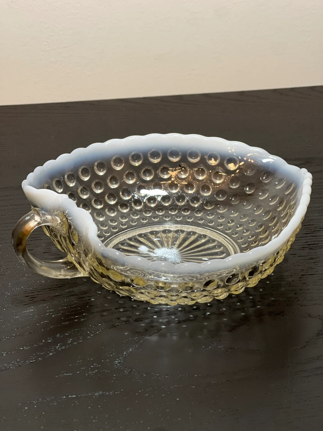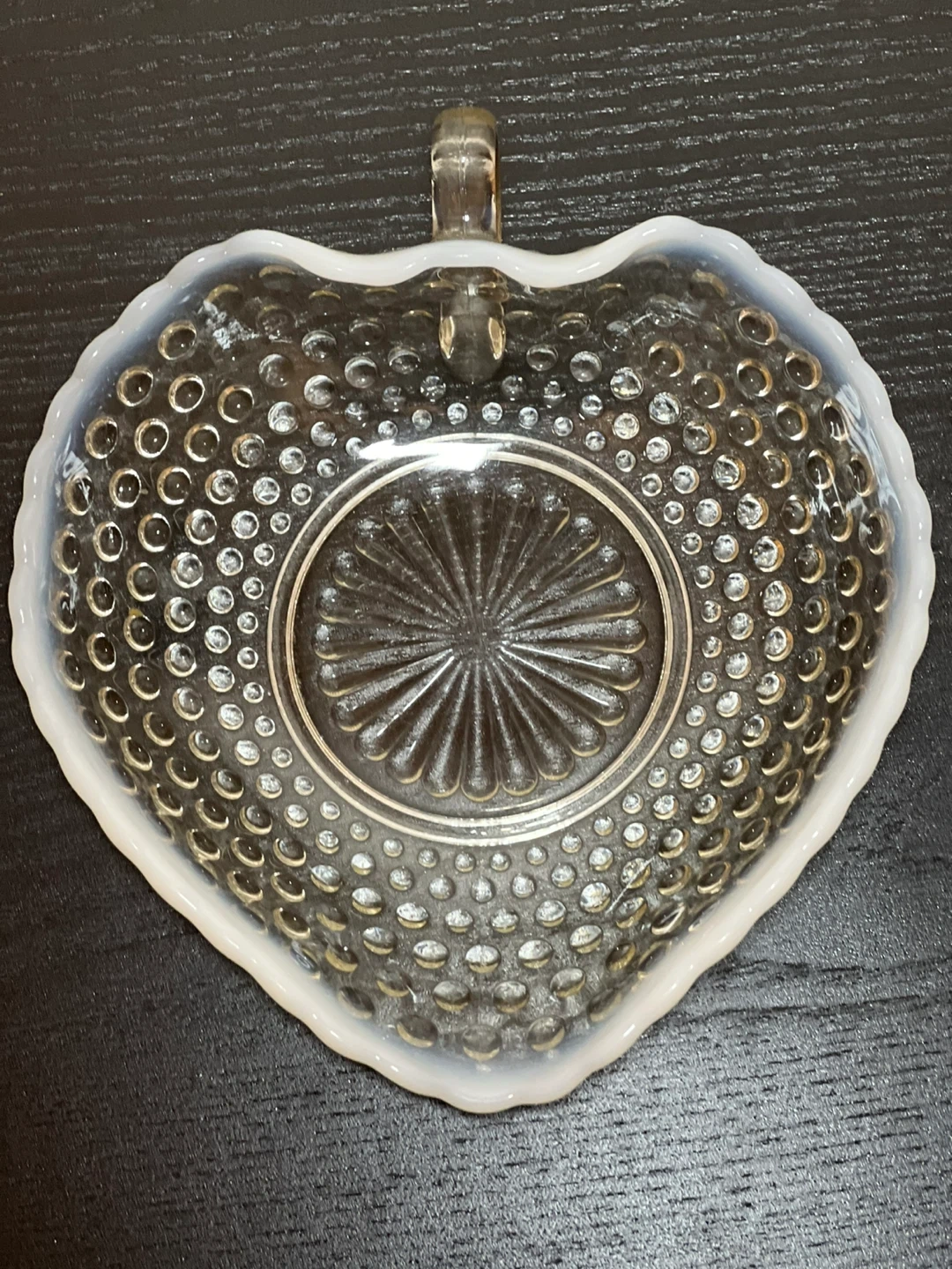 This vintage glass candy dish was made by Anchor Hocking between 1942 and 1946. It is in the Moonstone pattern with clear hobnail glass and an opalescent white ruffled edging. It has a decorative clear glass handle and is in the shape of a heart or leaf. Measures 7.25" long x 6.25" wide x 1.5" deep.