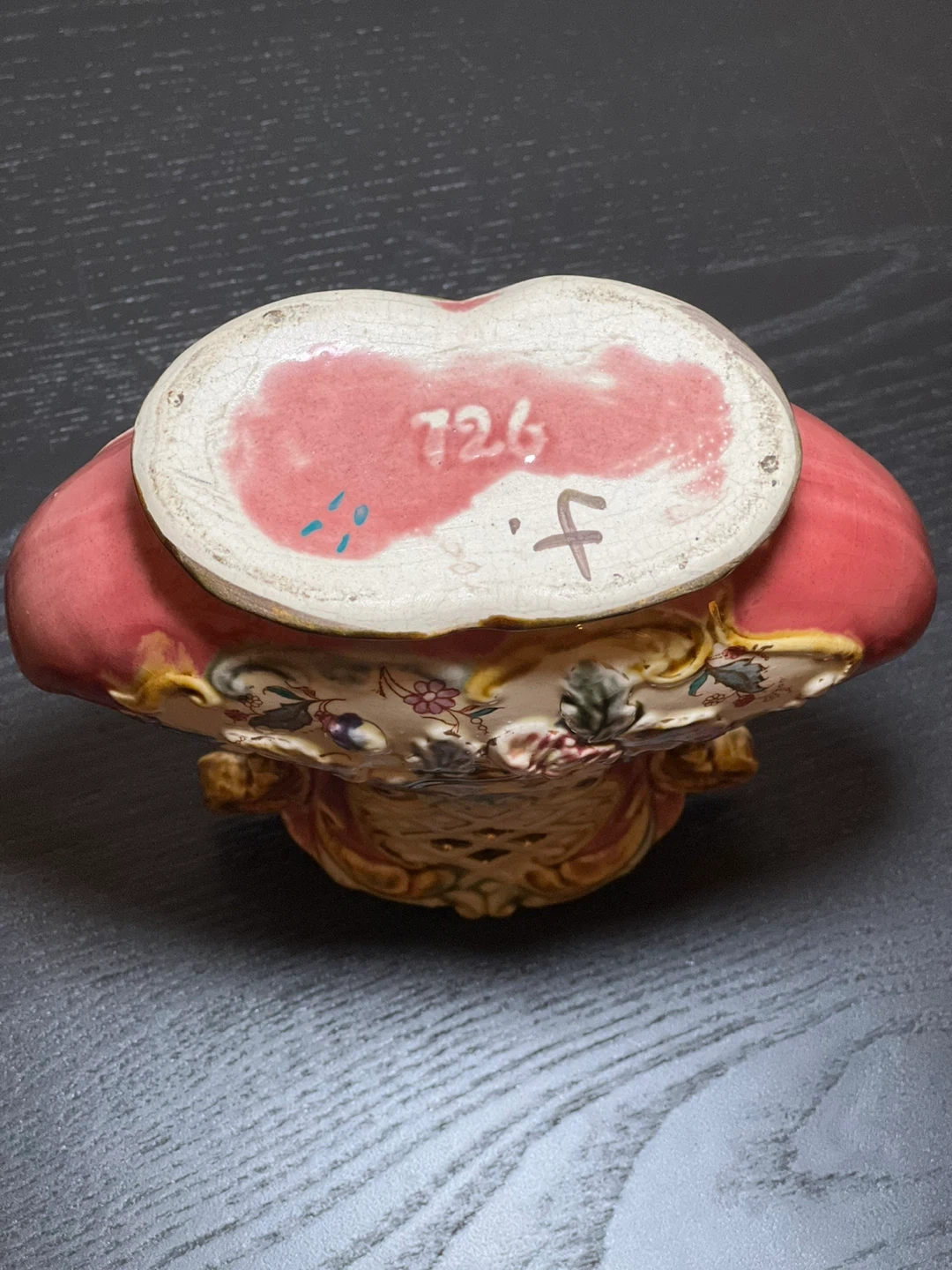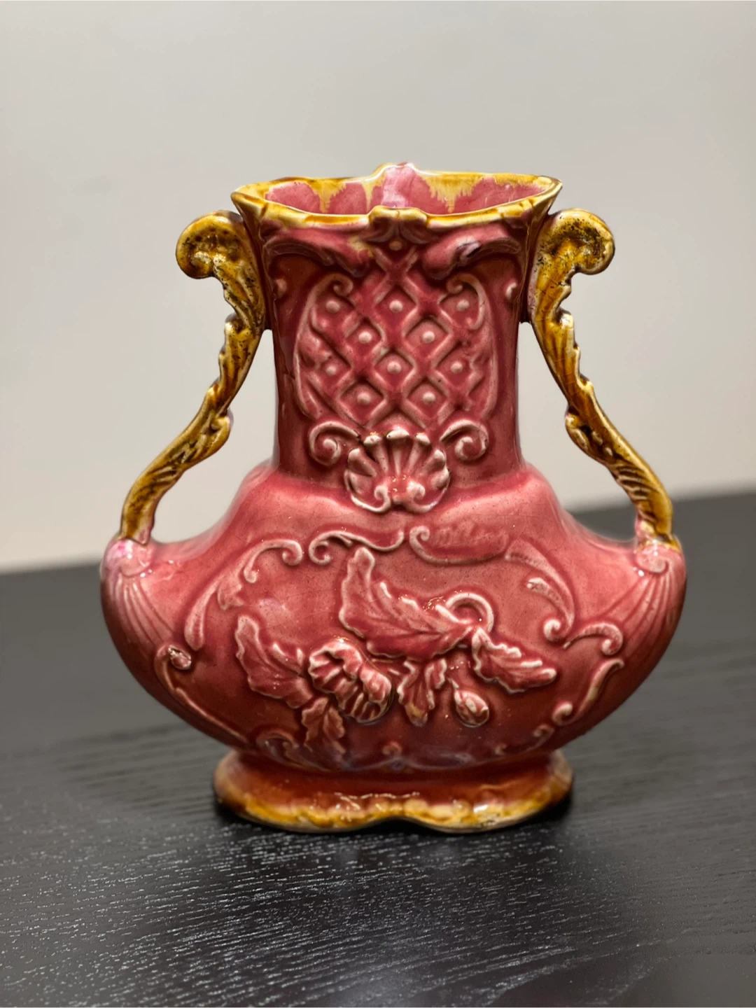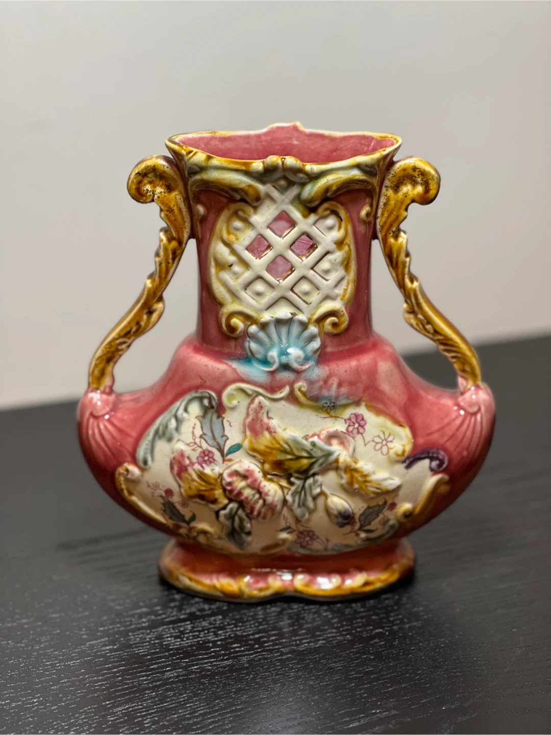 98Antique c.1900 Red Karlsruche Germany Grand Ducal Majolica Vase Floral 726. Reticulated