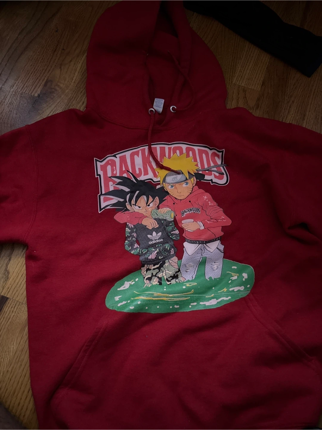 Red hoodie with a Backwoods logo and a graphic of Naruto and Goku. It's in great condition and ready for a new home!