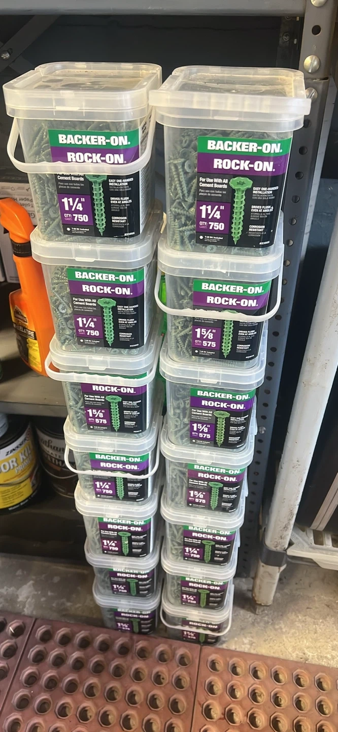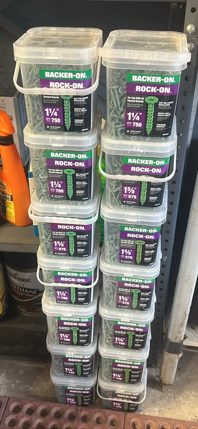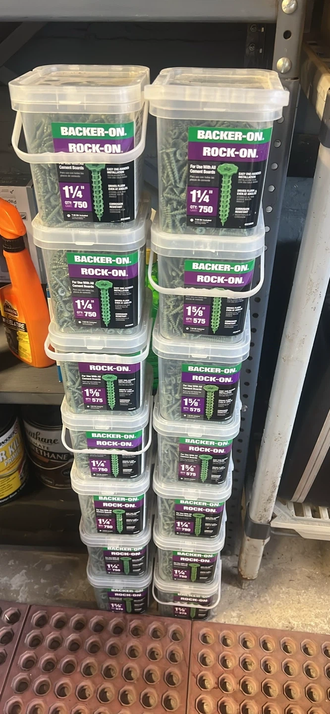 Selling buckets of Backer-On Rock-On cement board screws. Each bucket contains 750 screws, sized at 1 1/4". These are designed for use with all cement boards and feature an easy one-handed installation.
