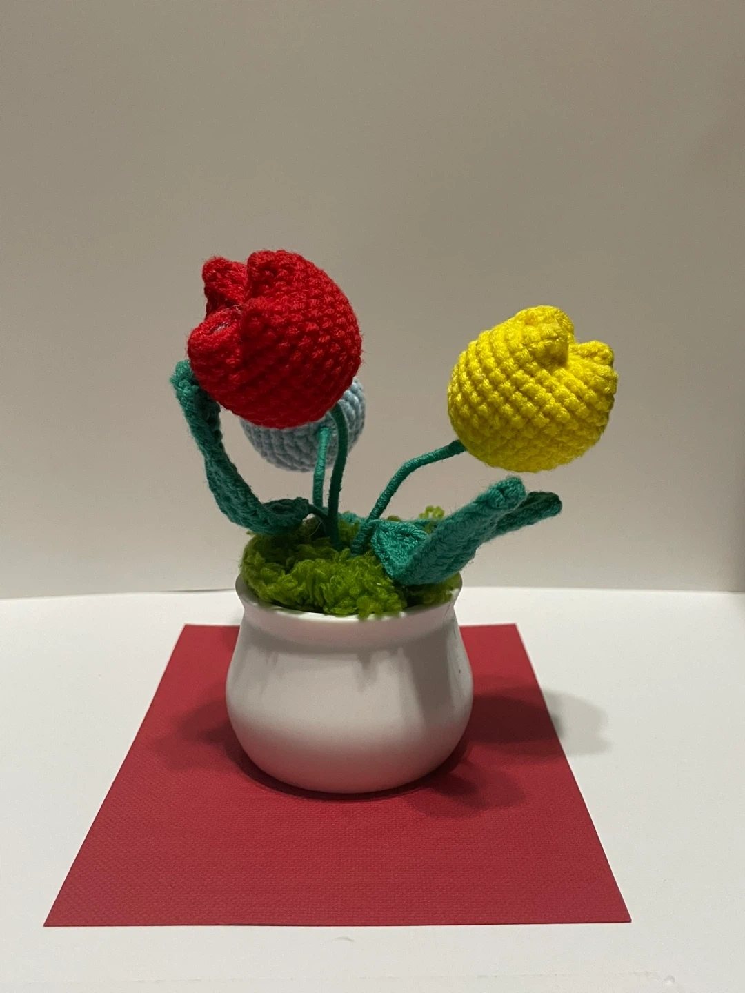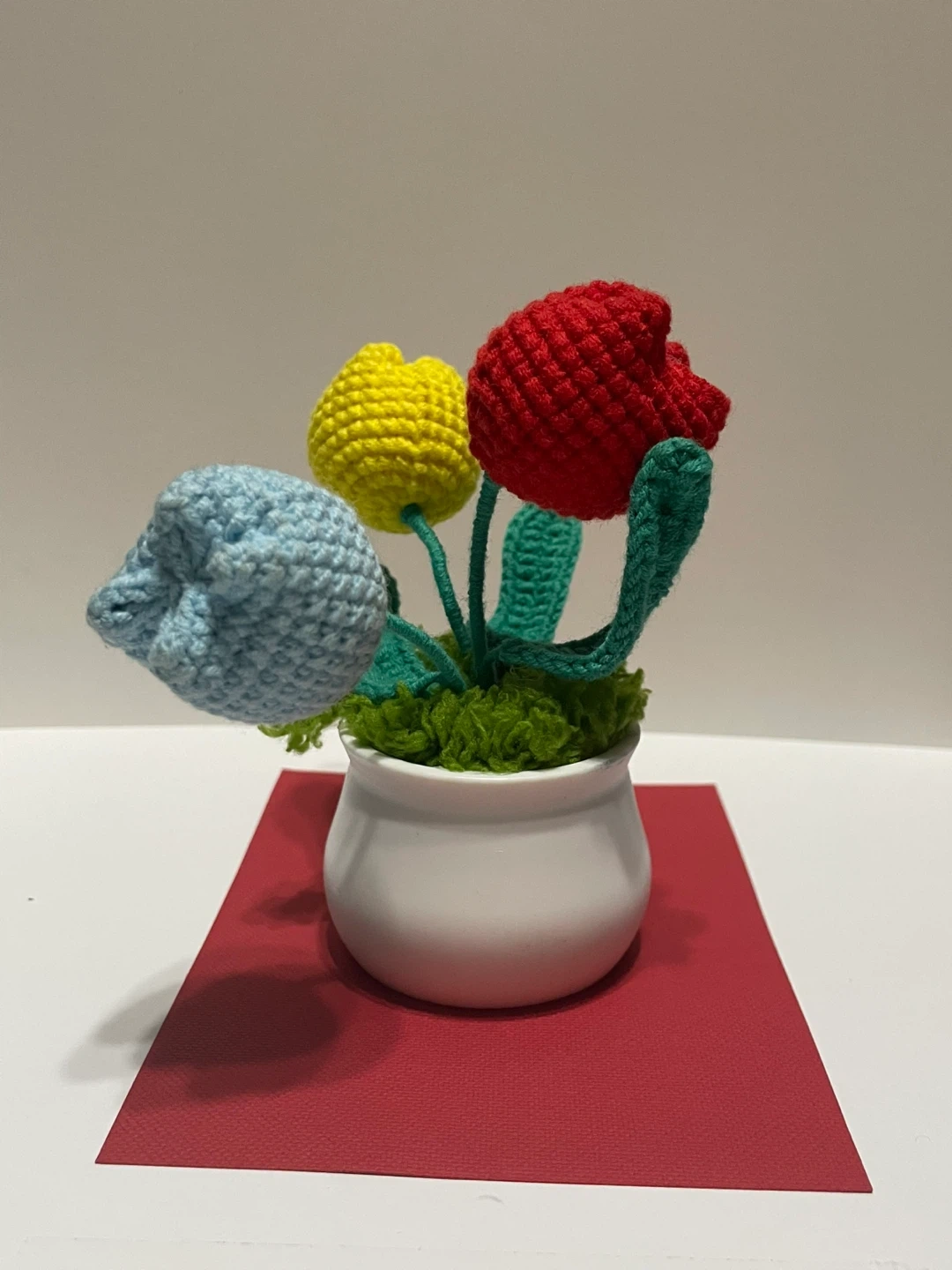 This is a cute, handmade knitted tulip flower pot. It features red, yellow, and blue tulips in a small white pot. It would be a great addition to any room! (5 inch -12 cm)