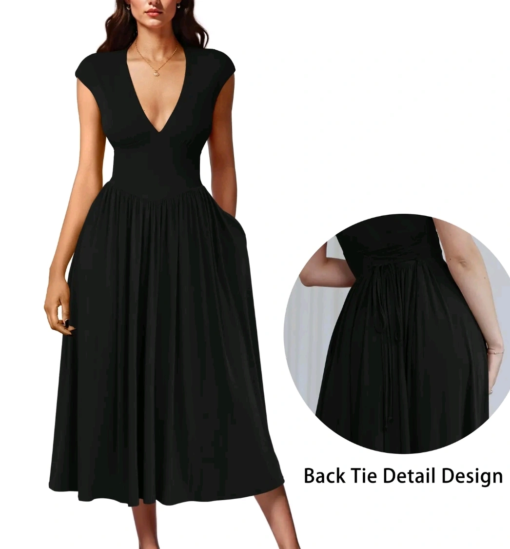 85This is a lovely black midi dress featuring a flattering V-neckline and pockets. Dress is in new condition, never worn. Perfect for any occasion!