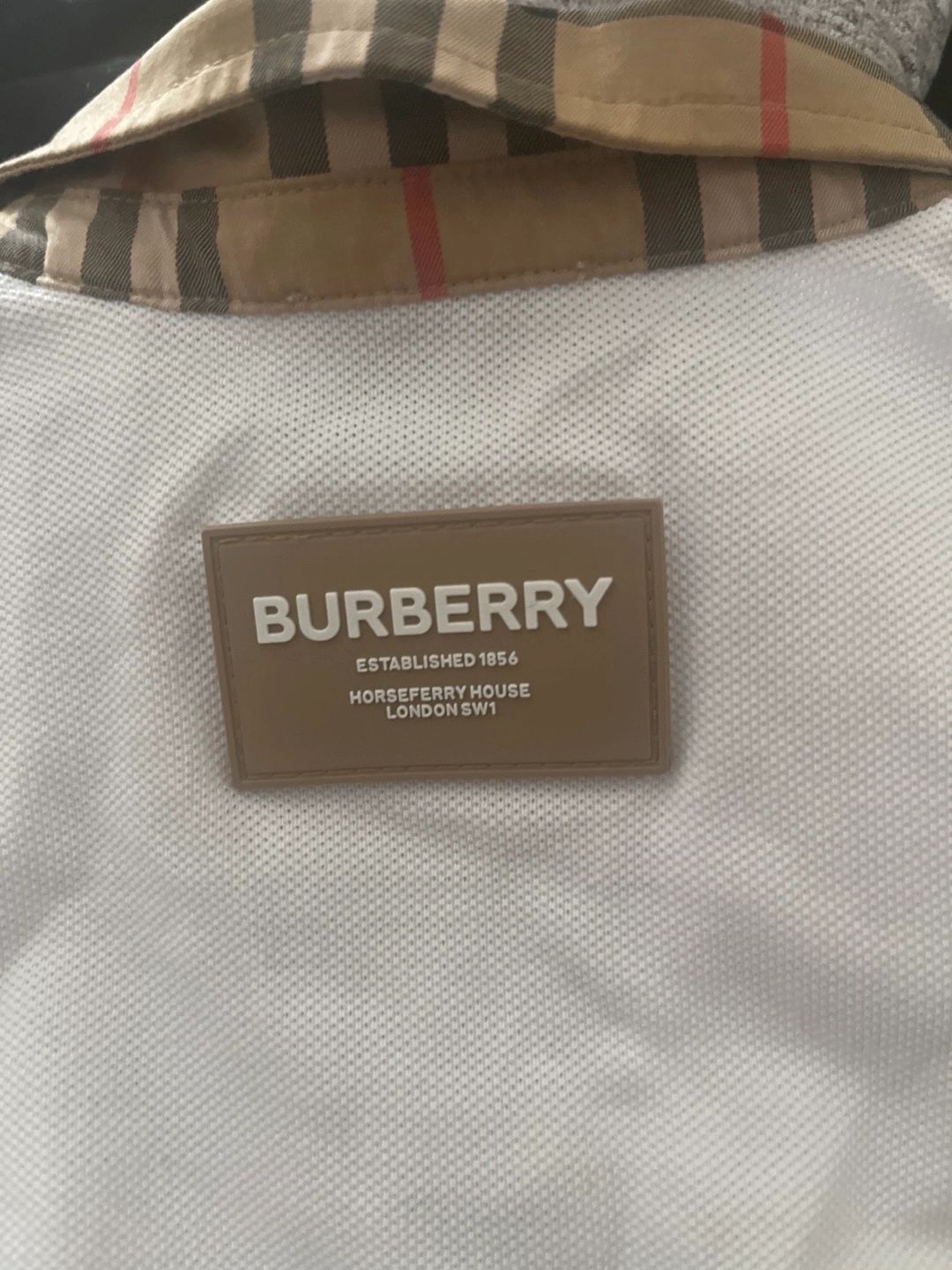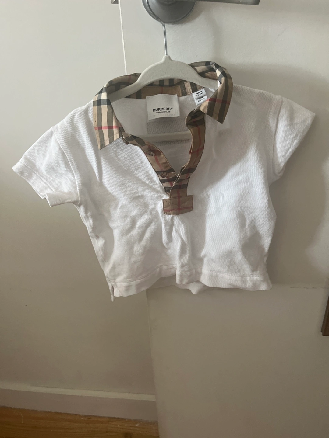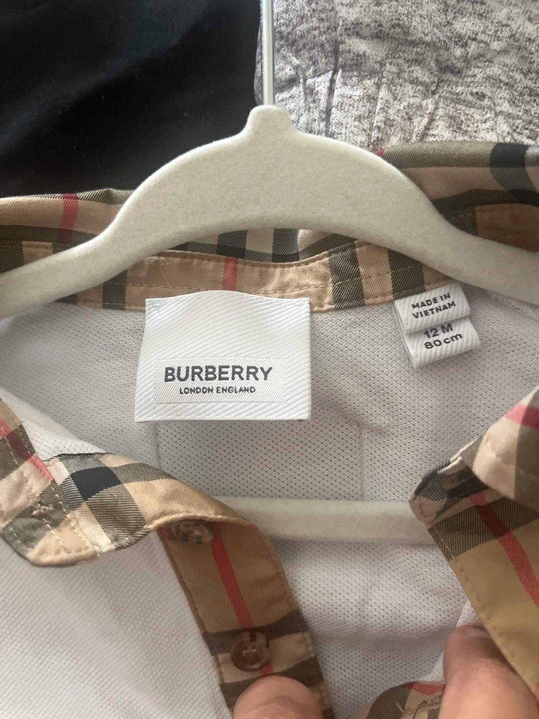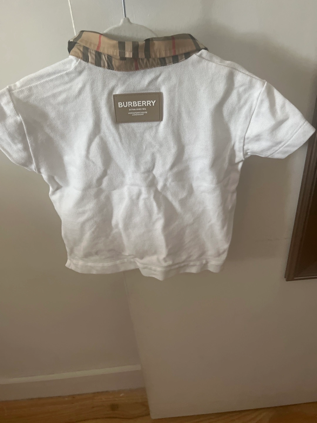 Selling a cute Burberry baby polo shirt. It's white with the classic Burberry plaid collar. The size is 12 months (80cm).