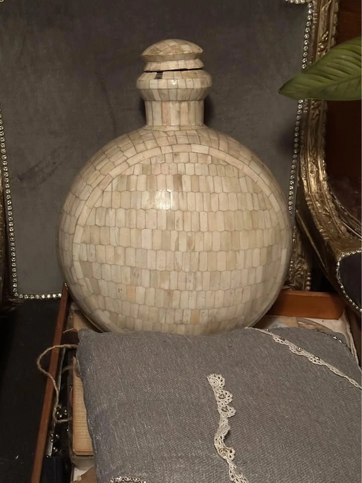 10Made from small bone tiles adhered to a hand crafted metal vessel. Traditional Moroccan Crafting. Missing a couple of tiles but still a beautifully crafted accent piece.