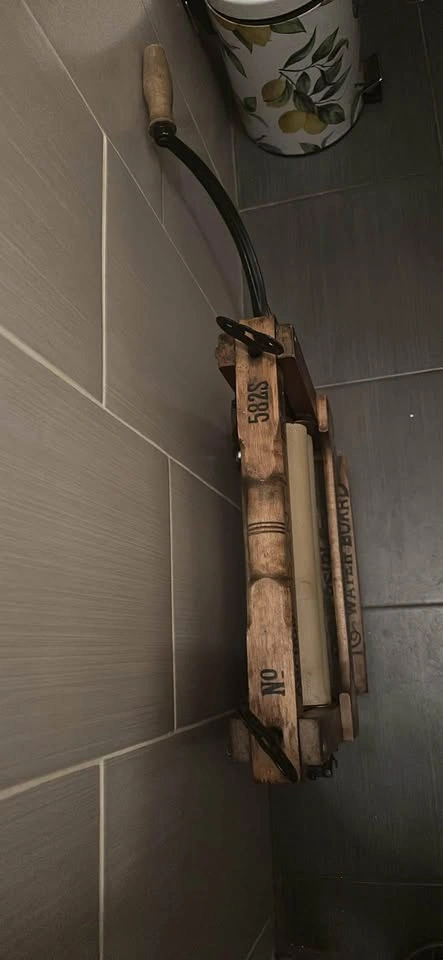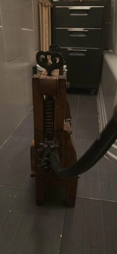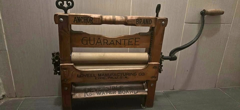 10This is a functional wooden clothes wringer made by the Anchor company featuring a reversible waterboard bucket clamp, rubber rollers and wrought iron mechanism for those who might wish to make use of it and for those who would choose to use it as decor it is beautifully patinated and has been cleaned, deoxidized and oiled so it is ready to give your space oodles of olde world charm with tons of beautiful turn of the century script that conjures up images of men in striped one piece bathing suits, handle bar mustaches and straw hats… All offers considered