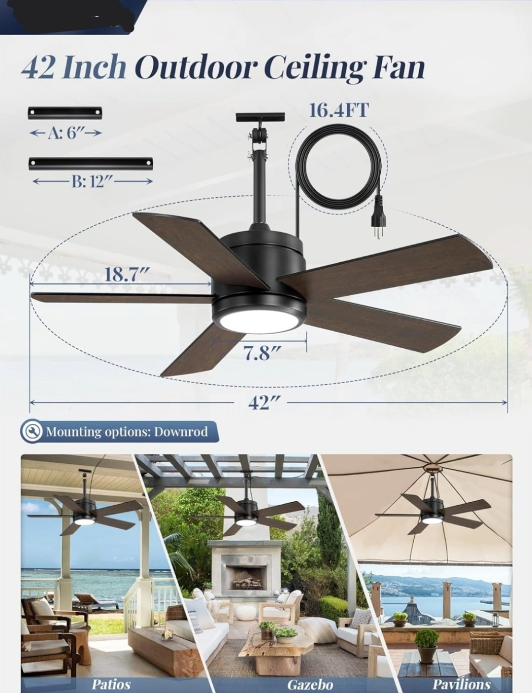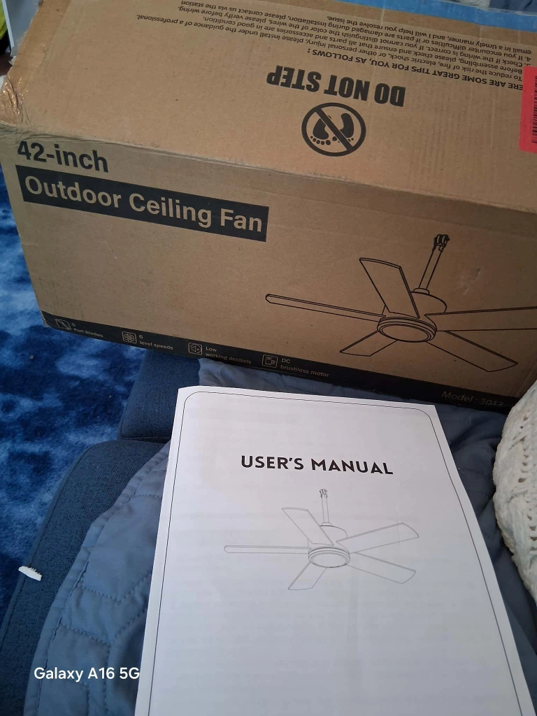 Selling a brand new, 42-inch outdoor ceiling fan still in its original box! The box includes the user's manual and all components for installation. It features a DC brushless motor for quiet operation and has multiple speed levels. Perfect for patios, gazebos, or pavilions