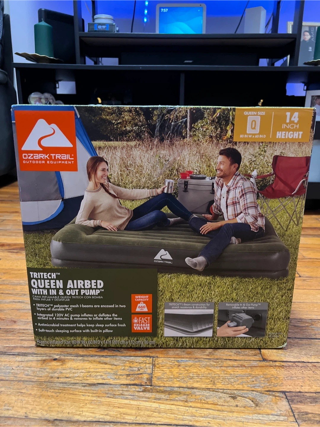 60Selling a brand new Ozark Trail Queen Airbed with a built-in pump! It's queen size, with dimensions of 80 in W x 60 in D and 14 inches in height. This airbed features TriTech polyester mesh I-beams encased in two layers of durable PVC material. It also has an integrated 120V AC pump that inflates and deflates the airbed, along with an antimicrobial treatment to keep the surface fresh