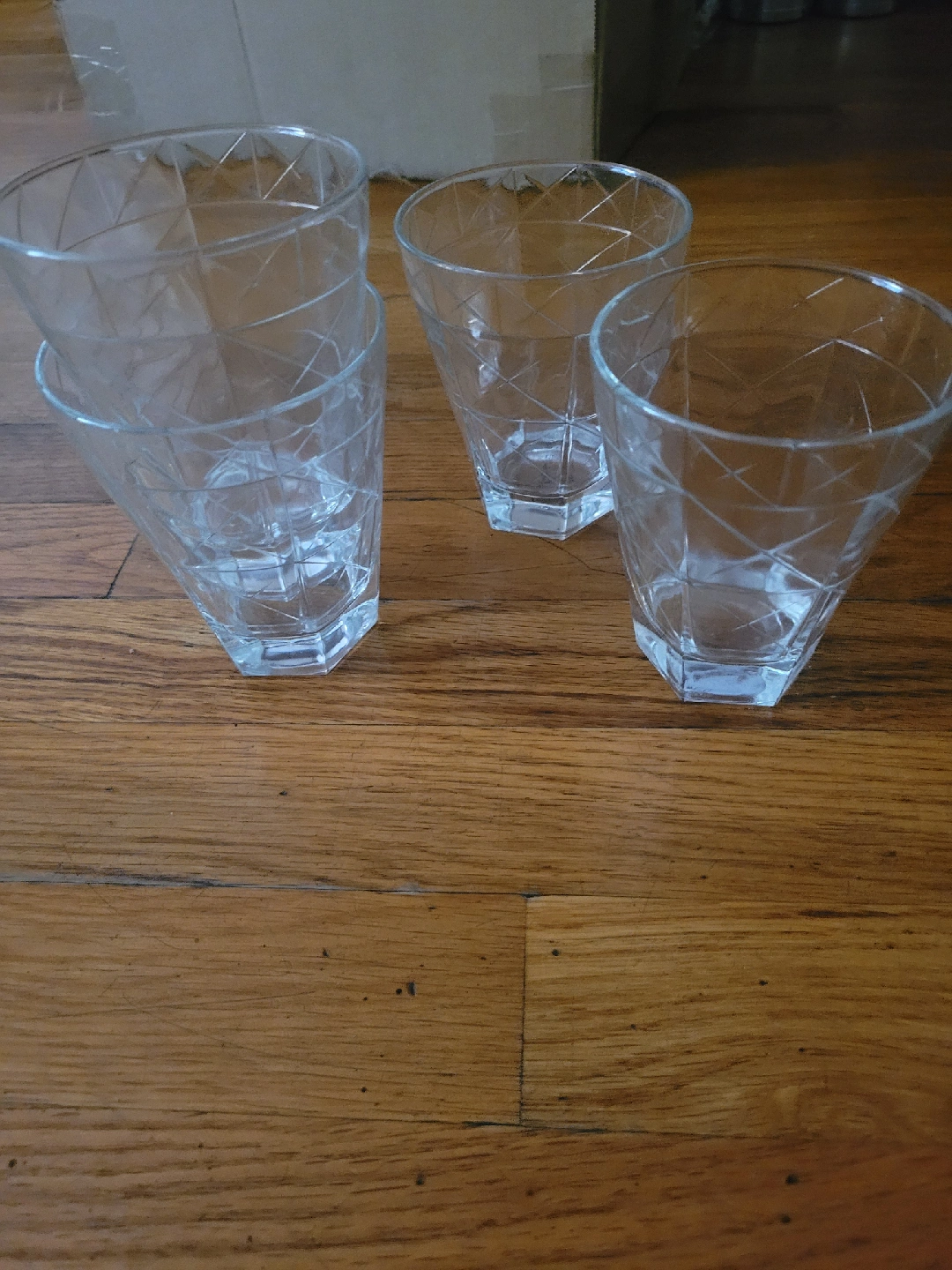 34Selling a set of 4 clear drinking glasses. They have a unique geometric design and are in great condition. Perfect for everyday use or entertaining!