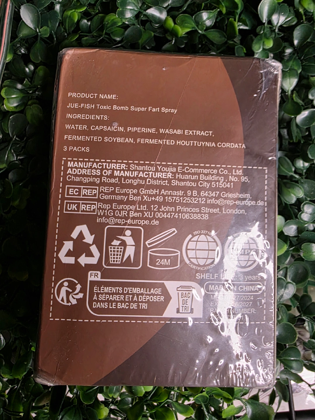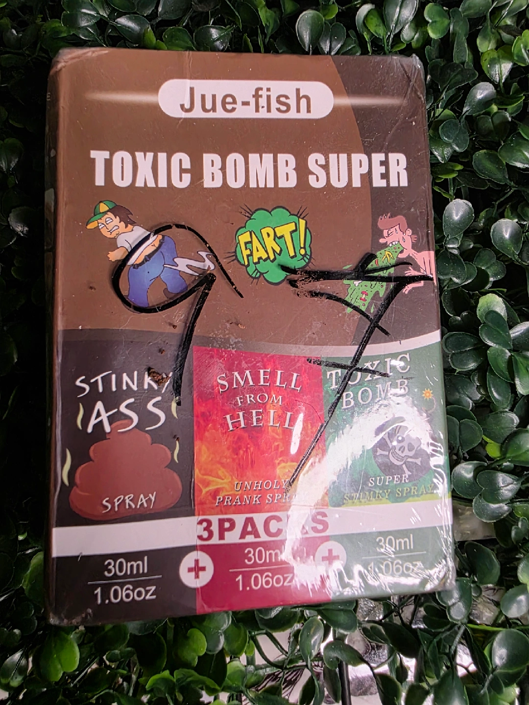Selling a pack of Jue-fish Toxic Bomb Super Fart Spray. It contains 3 packs, each with 30ml (1.06oz) of spray. The ingredients include water, capsaicin, piperine, wasabi extract, fermented soybean, and fermented houttuynia cordata. The expiration date is July 2027