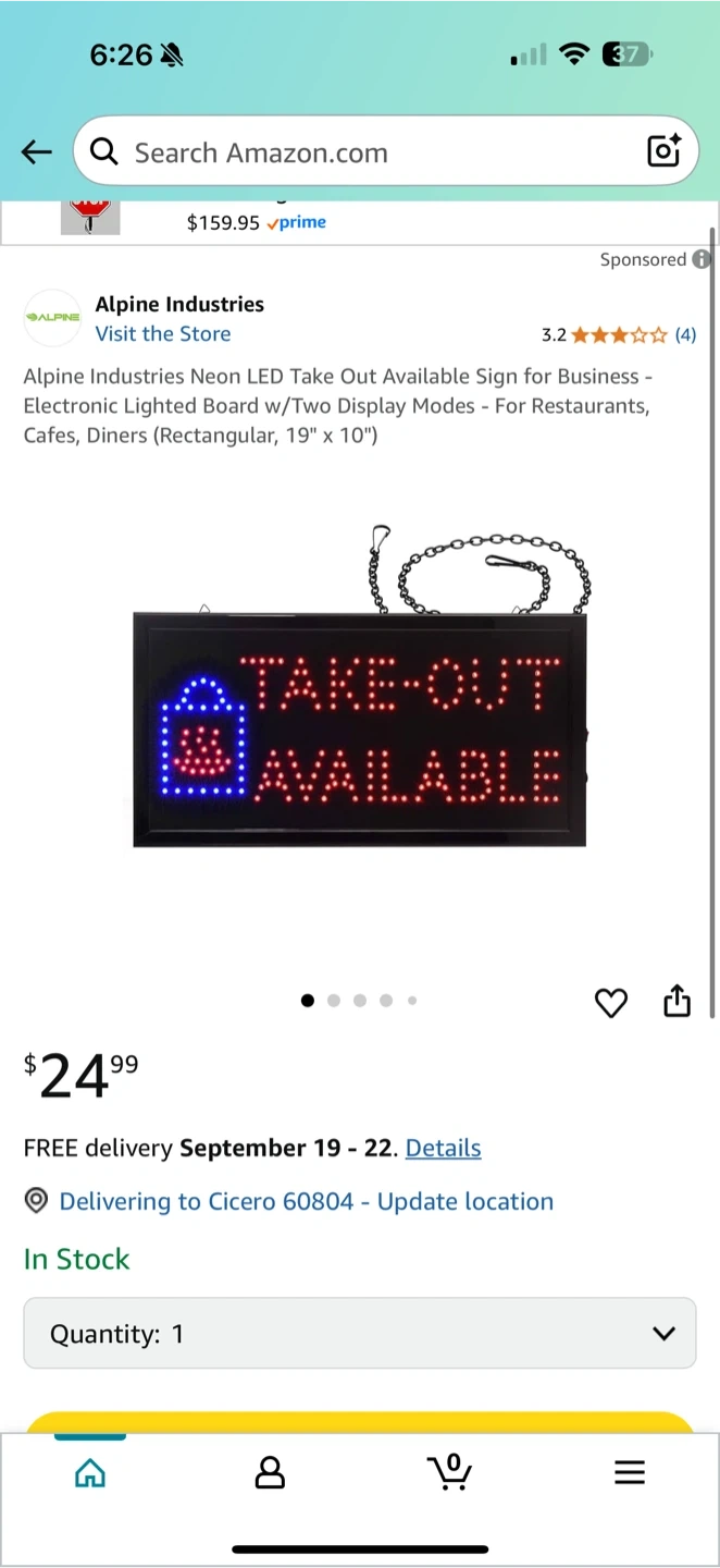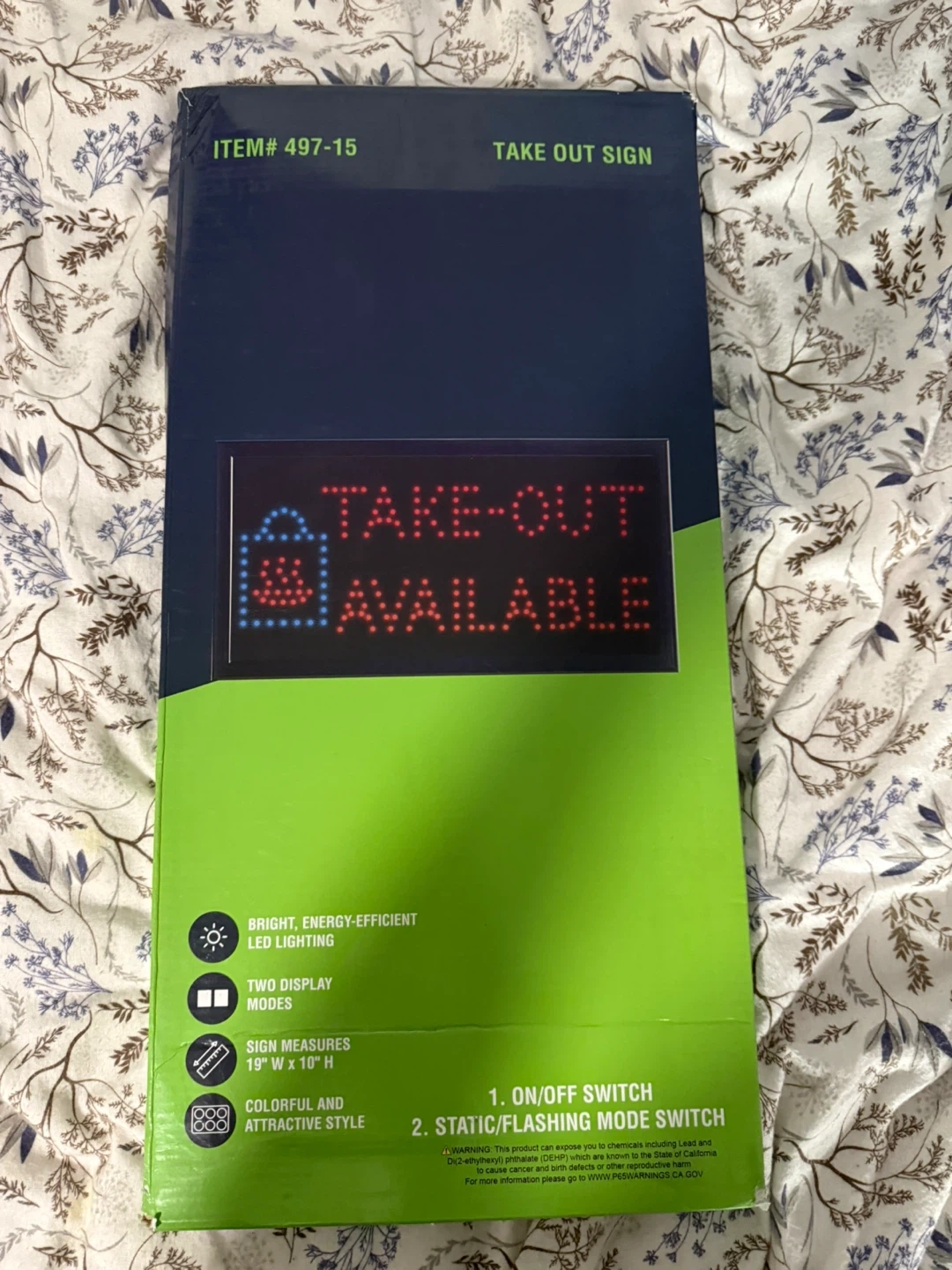 Selling an Alpine Industries LED Take Out Available Sign! It's perfect for restaurants, cafes, and diners. The sign measures 19" W x 10" H and features bright, energy-efficient LED lighting with two display modes. It has a colorful and attractive style to catch the eye of customers