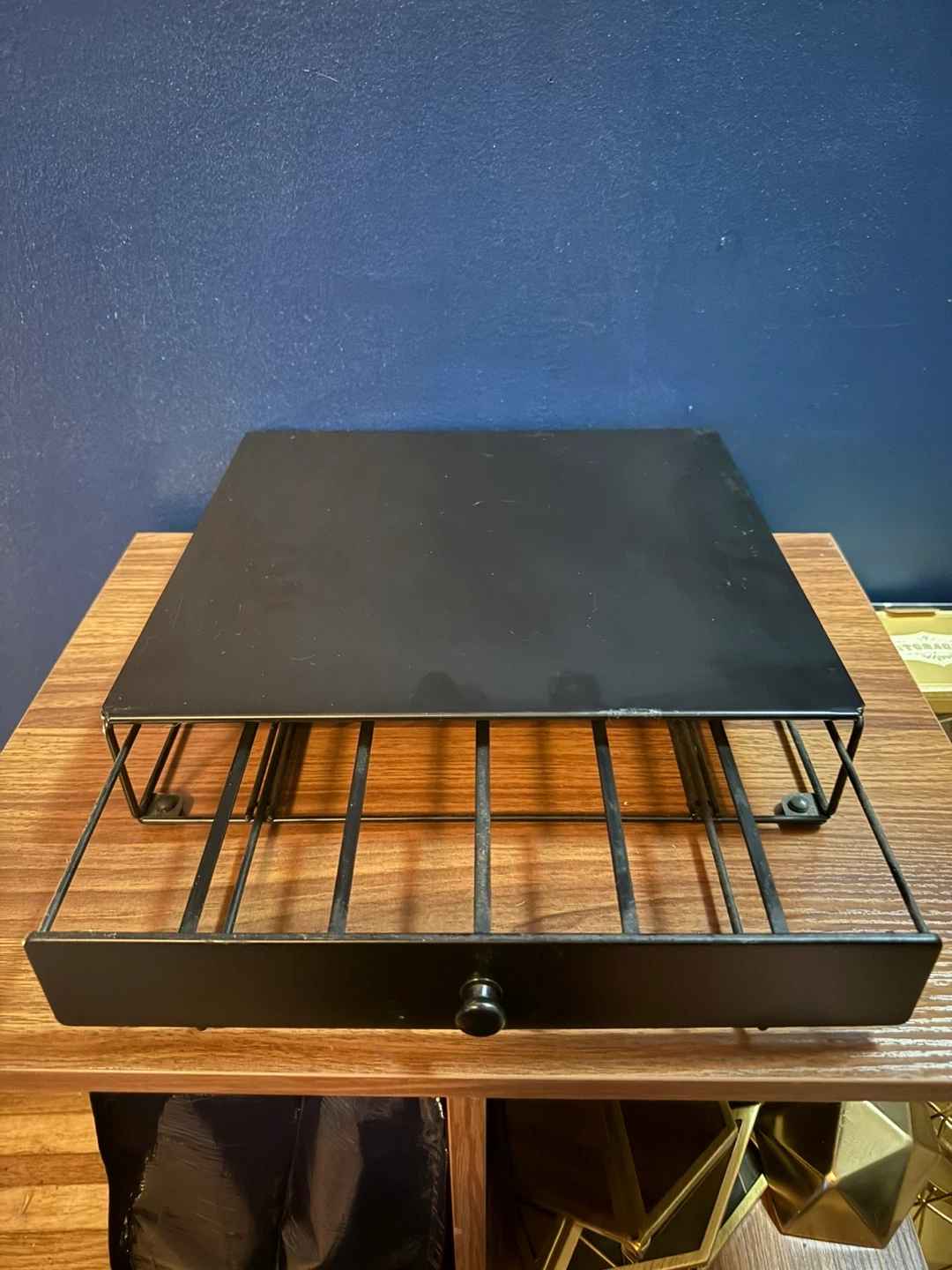 This is a black k-cup drawer organizer. It’s perfect for keeping your coffee pods neat and tidy. It's in good condition and ready for a new home