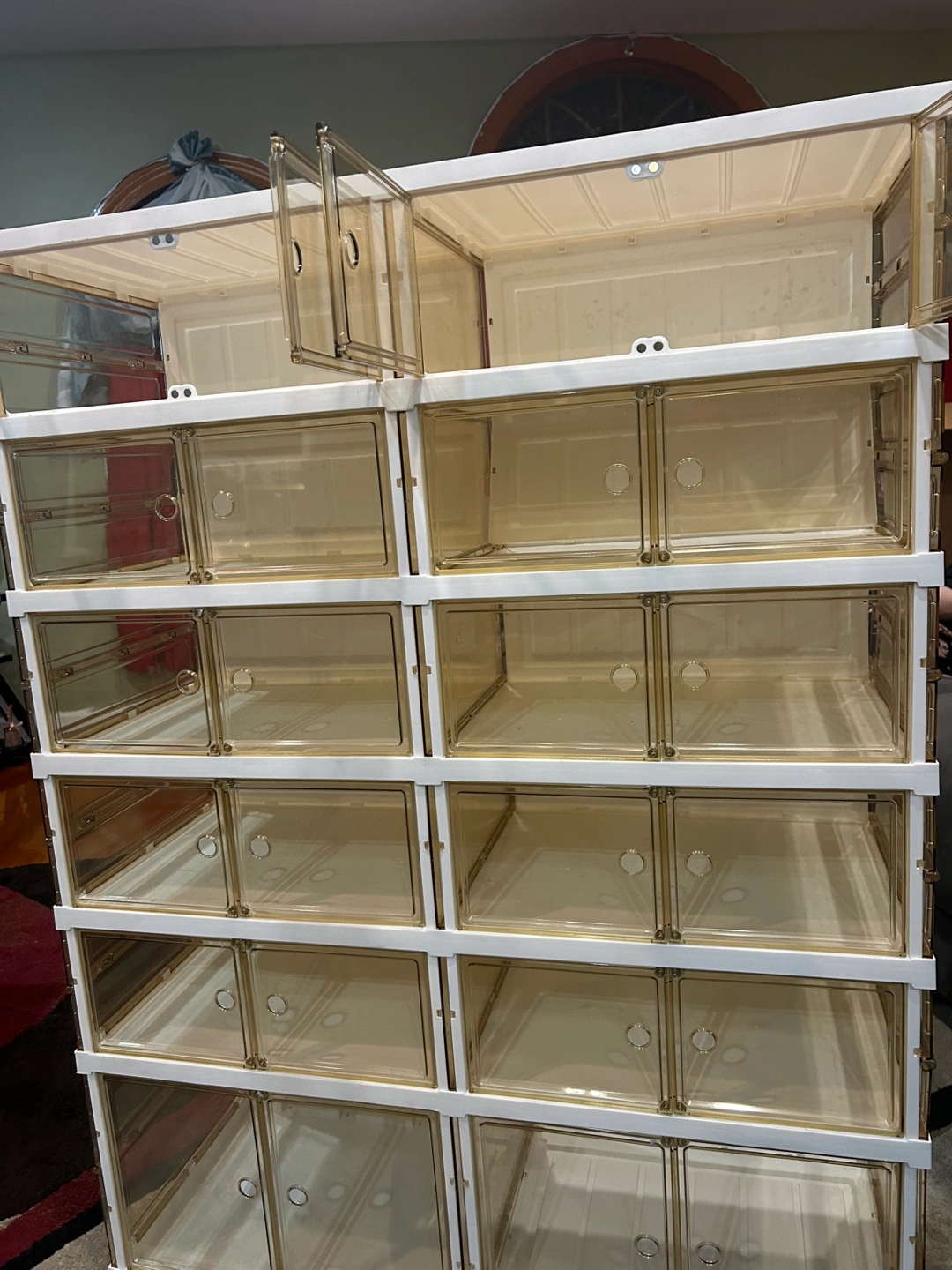 This is a collapsible storage container cabinet. It's perfect for organizing items in your home or office. It features clear doors so you can easily see what's inside. The cabinet is in great condition and ready for a new home