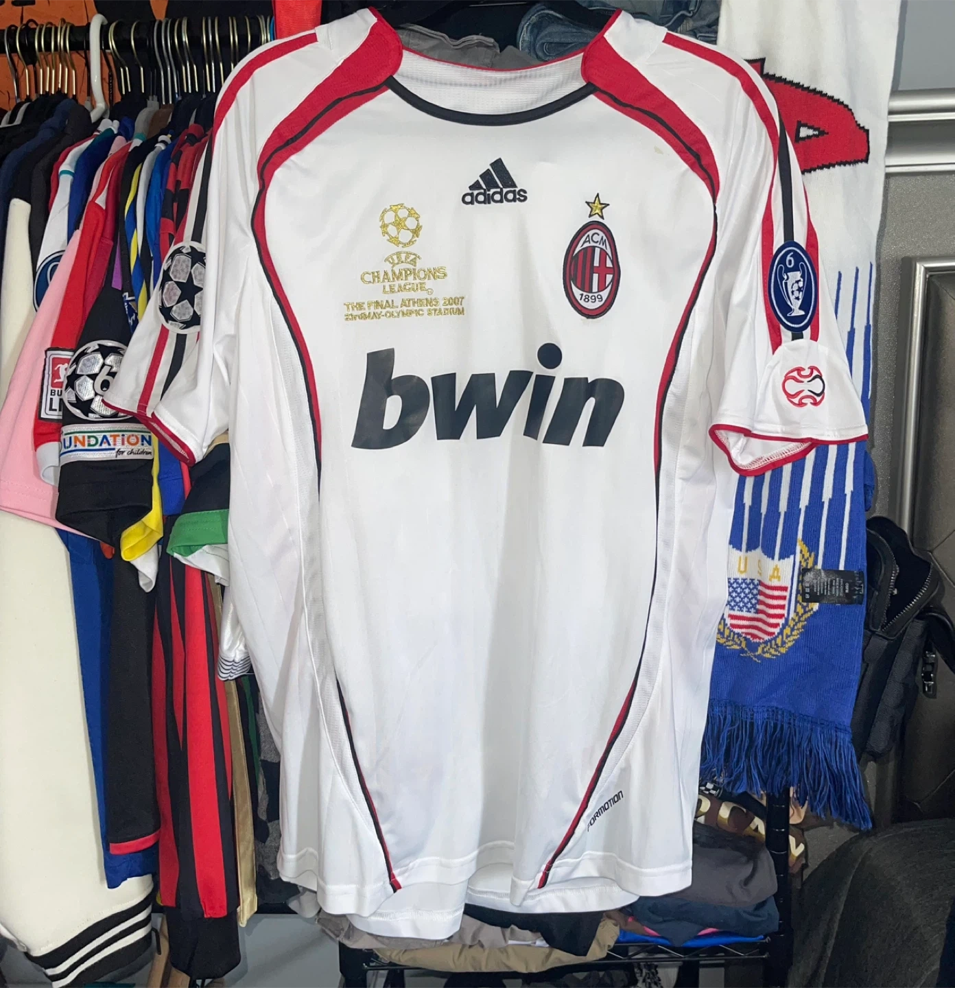 Selling an Adidas AC Milan Kaka #22 jersey. It's white with red and black accents. The jersey features the Adidas logo and the AC Milan club crest. Perfect for any soccer fan!
