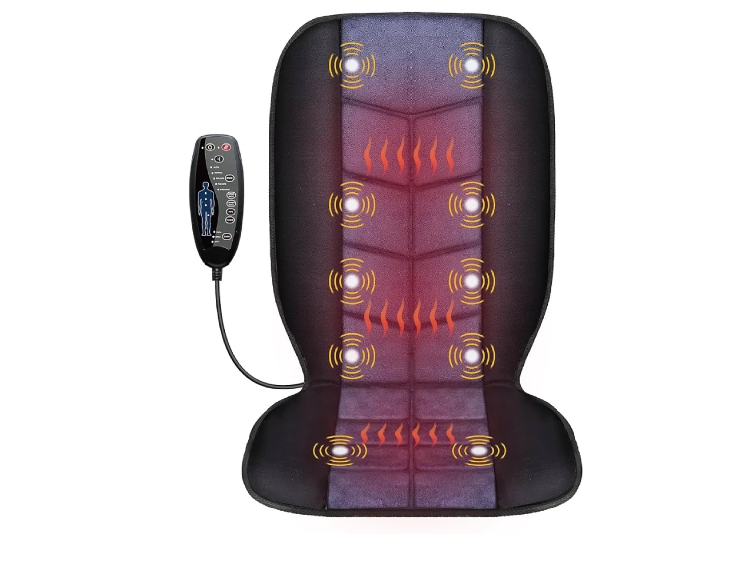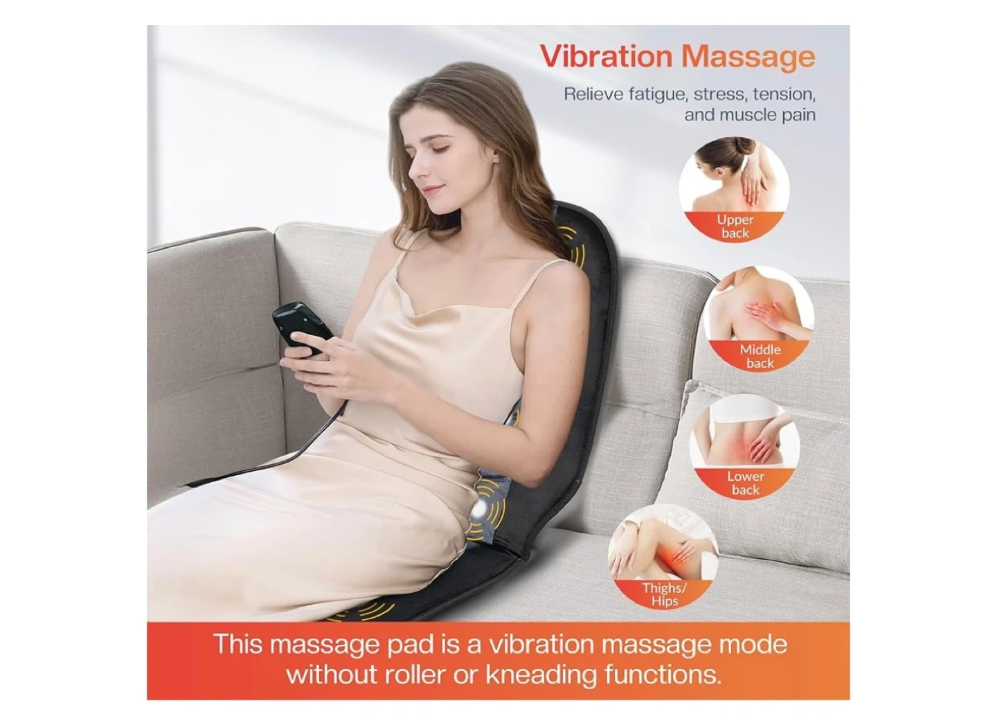 46Relieve fatigue, stress, tension, and muscle pain with this massage seat pad! It features a vibration massage mode without roller or kneading functions. The intelligent and safe heating function includes overheat protection and a 30-60-90 minute auto-off timer, with 2 heating levels. The super soft plush material and exquisite hemming add to the comfort, and straps secure it to any seat