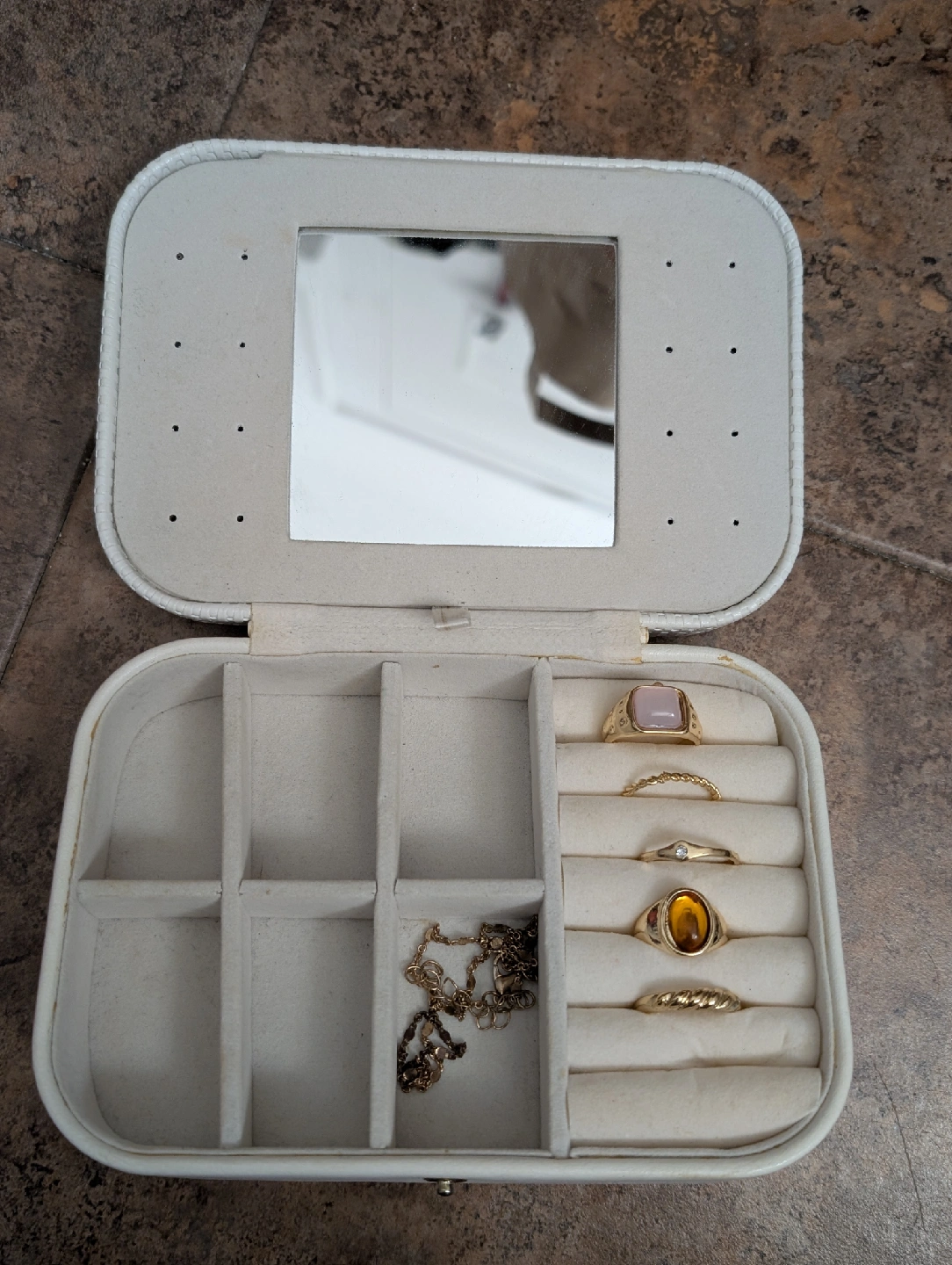 Rings $2 each Take all for $14! Selling a white Vlando jewelry box! It’s perfect for storing rings, necklaces, and other small accessories. The interior is lined with soft material to protect your jewelry from scratches. It includes a mirror and several compartments for organization.