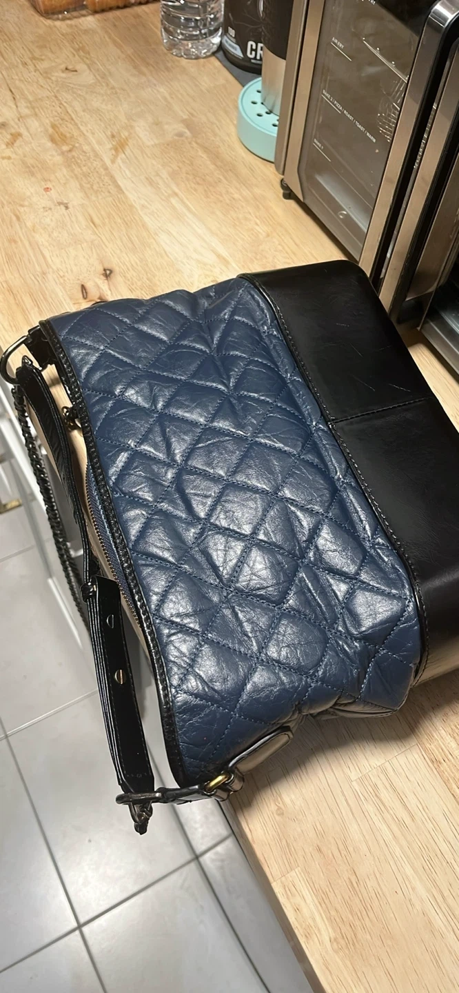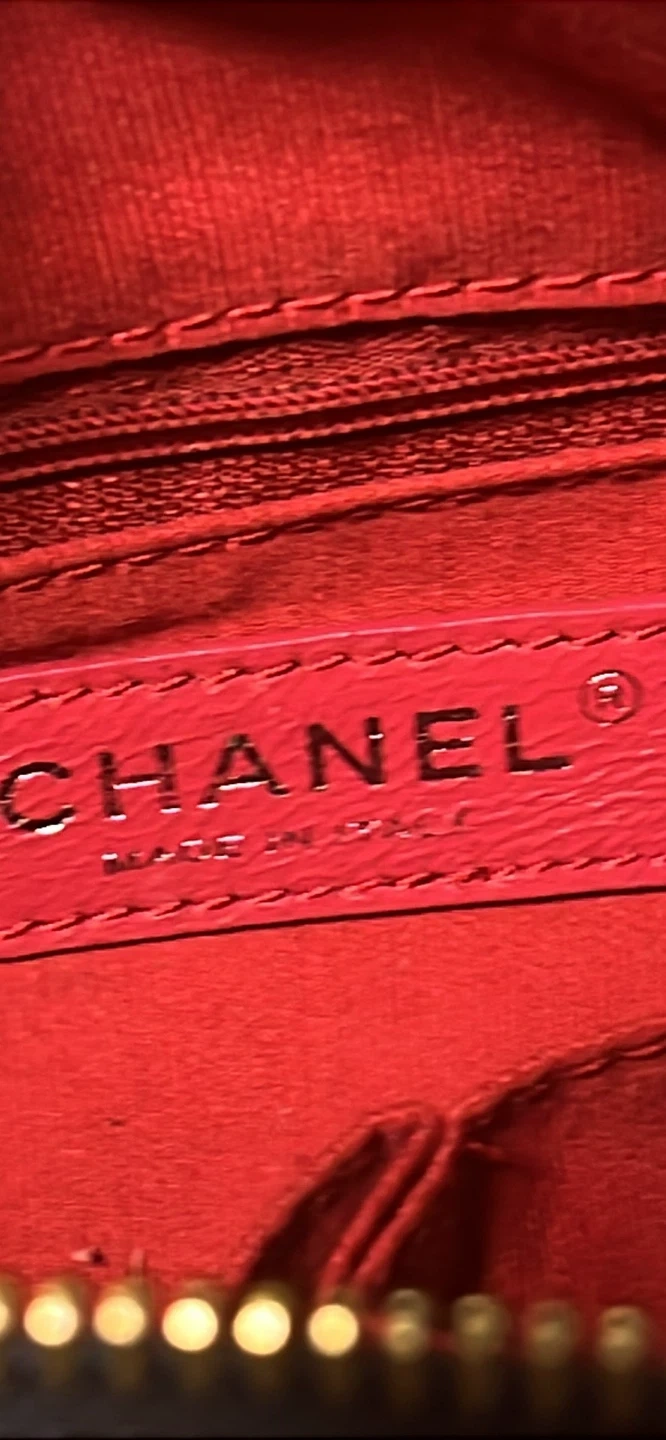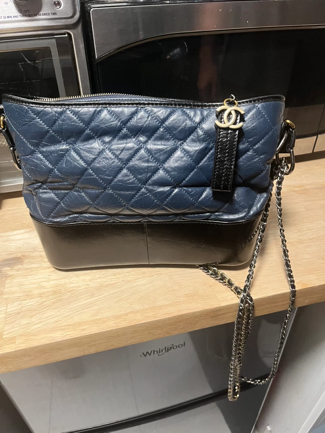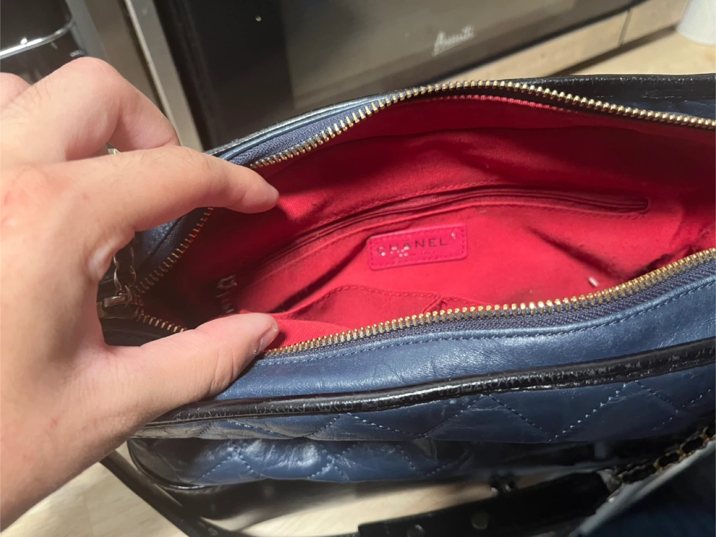 Selling a Chanel shoulder bag in blue and black leather. It features a quilted design and a chain strap. The interior is lined with a vibrant red fabric. Serial number 10218184