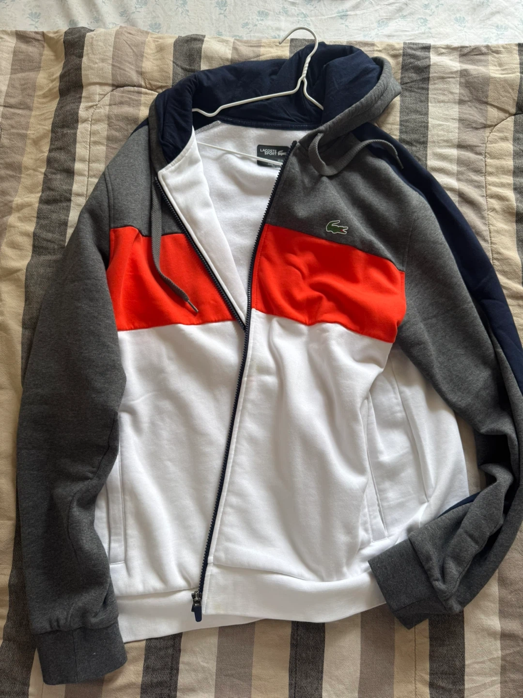 130Selling a Lacoste Sport colorblock zip-up hoodie. It features a stylish design with gray, orange, white, and navy blue color blocking. Perfect for casual wear or sports activities. The hoodie is in good condition and ready for a new home
