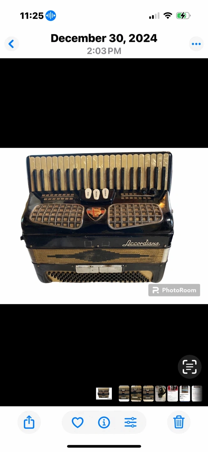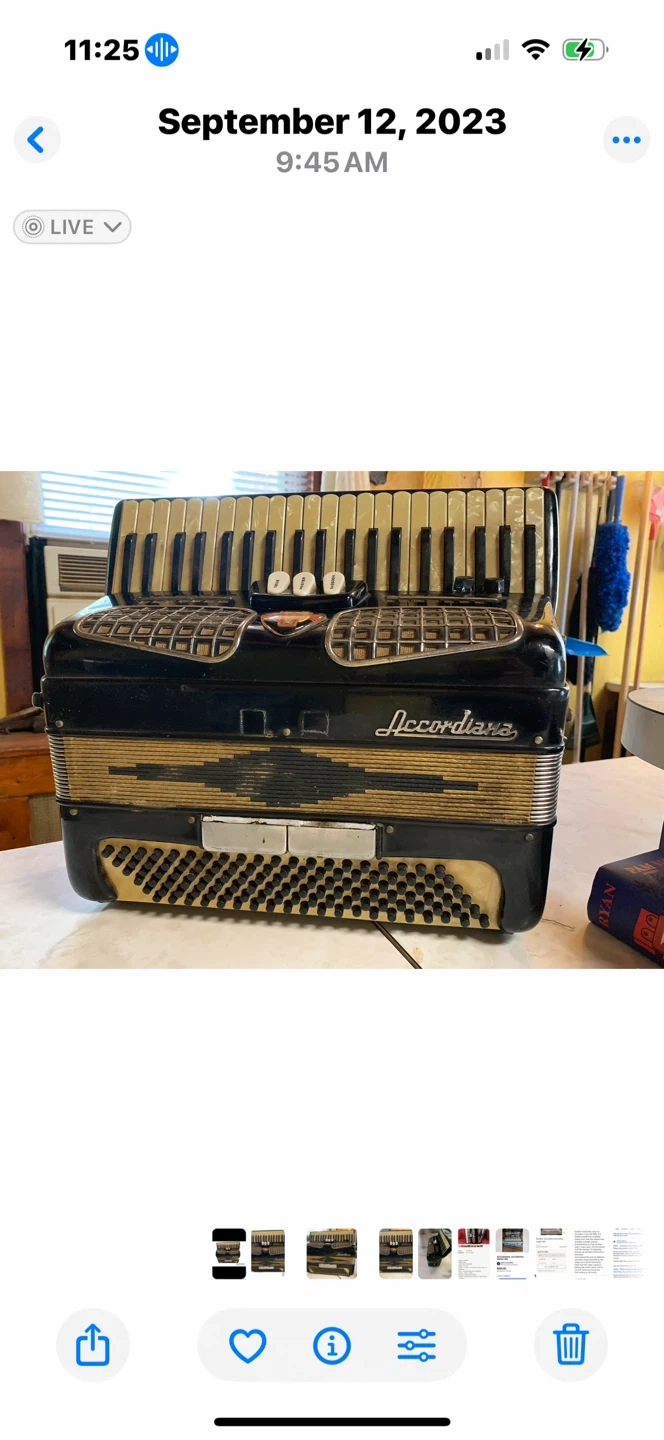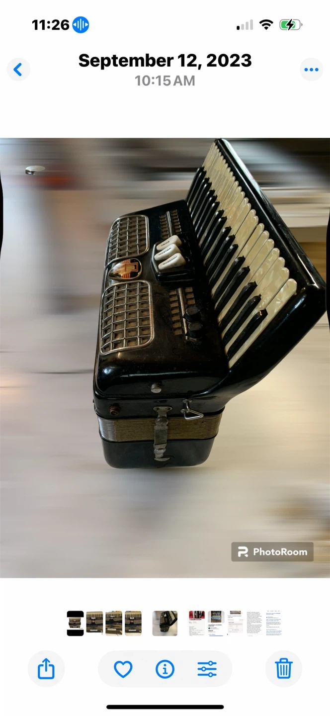 The accordion was mine. I started playing it when I was about six years old and my teacher, recognized my talent and placed me in the front of the band where we would go and play at places like nursing homes and places like that. The accordion has been modified to play with an amplifier which I still have. It is a tube amplifier and you can have that if you take the accordion, I have no idea what condition it's in. It's been a long time since I've used it. To my knowledge, the accordion still works fine, except the leather straps need to be replaced as time has taken a toll on them. I know instruments don't usually lose their value, but I'm selling the accordion as is, it needs to be refurbished, but I'm never going use it again. Now I have a keyboard which I hardly ever use either. Not sure if I want to sell that, but I might with the right offer.