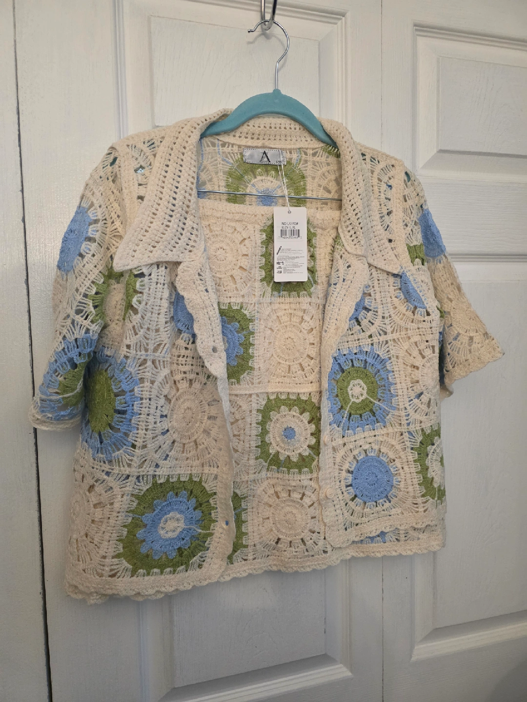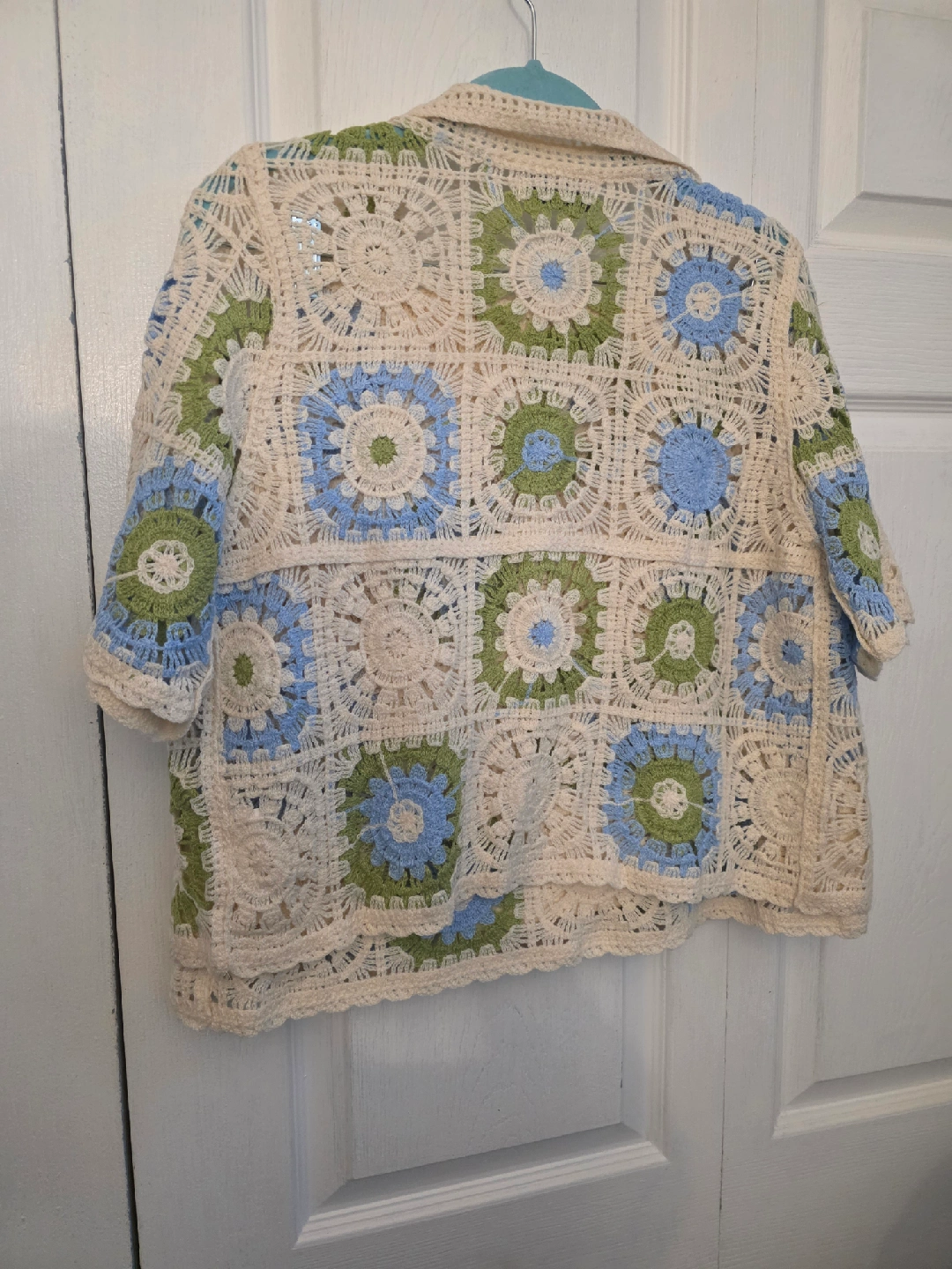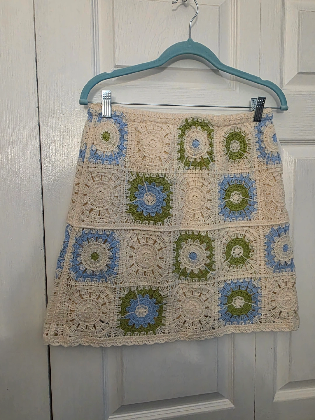Selling a cute crochet knit skirt and jacket set. The set features a cream base with blue and green floral square patterns. Perfect for a unique and stylish look! sized a large best fit for an extra small or small.