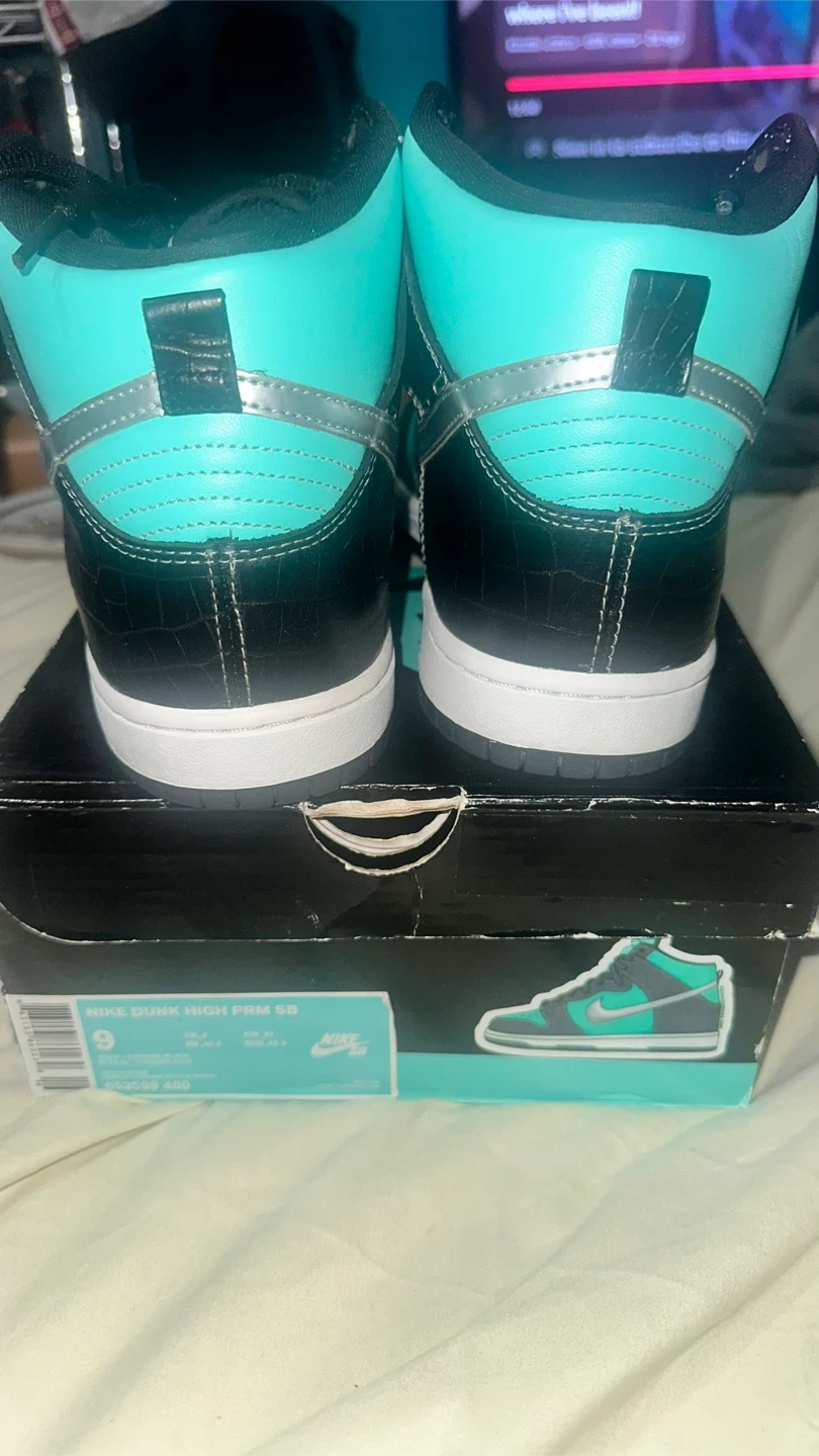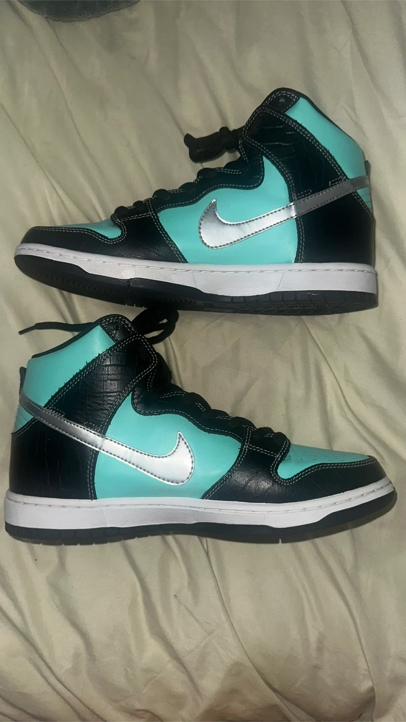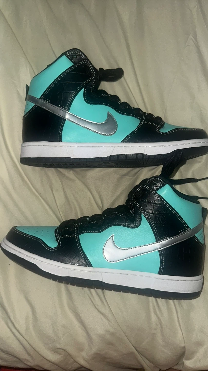 Selling a pair of Nike Dunk High SB in the Tiffany colorway, size 9. These shoes are in great condition and come with the original box!
