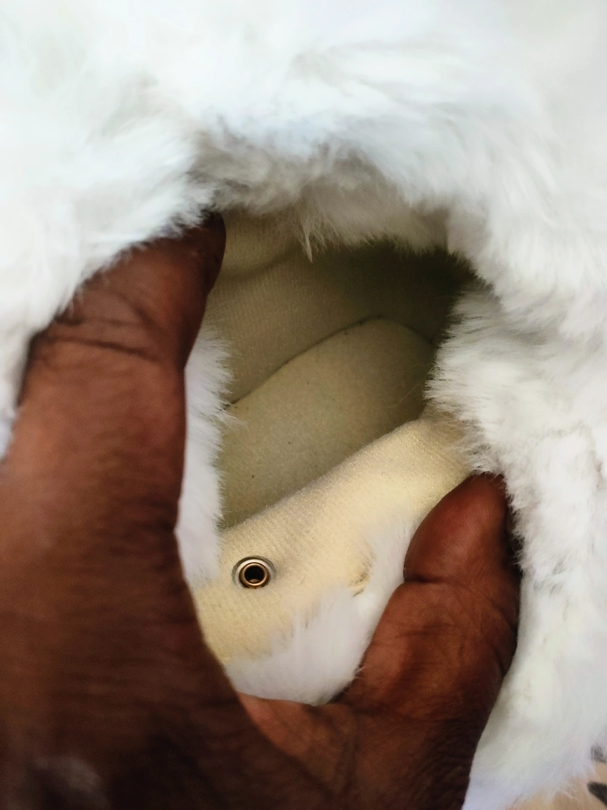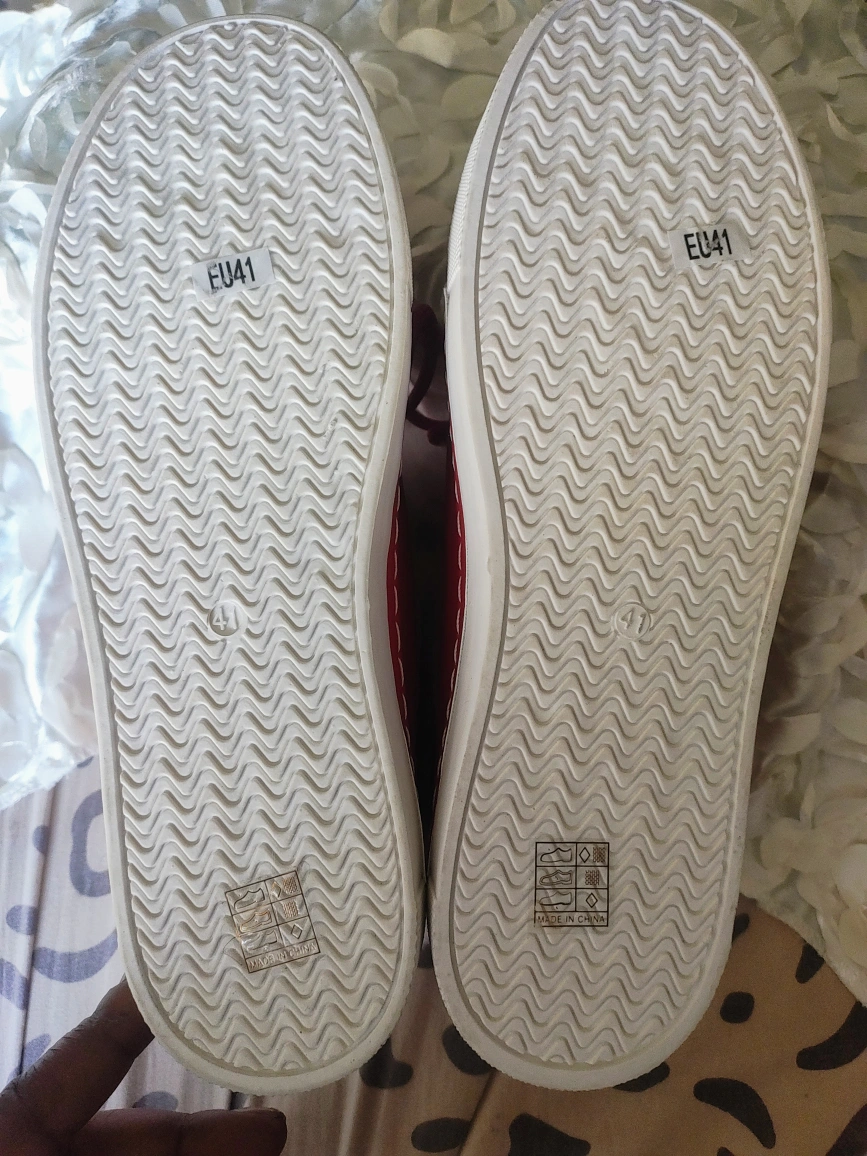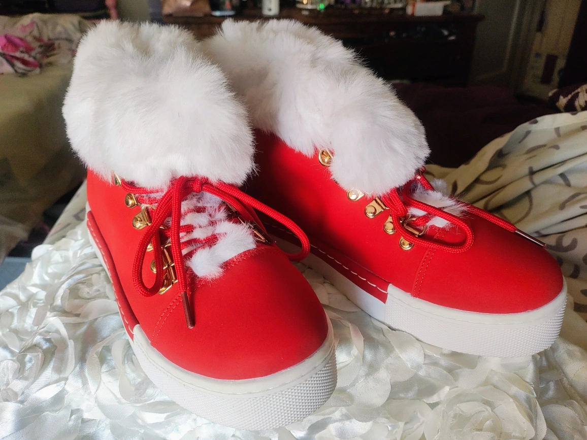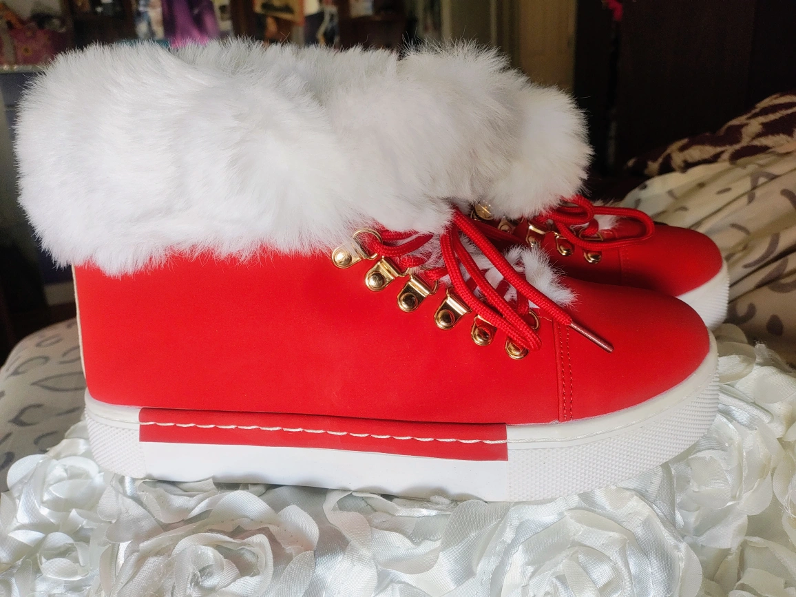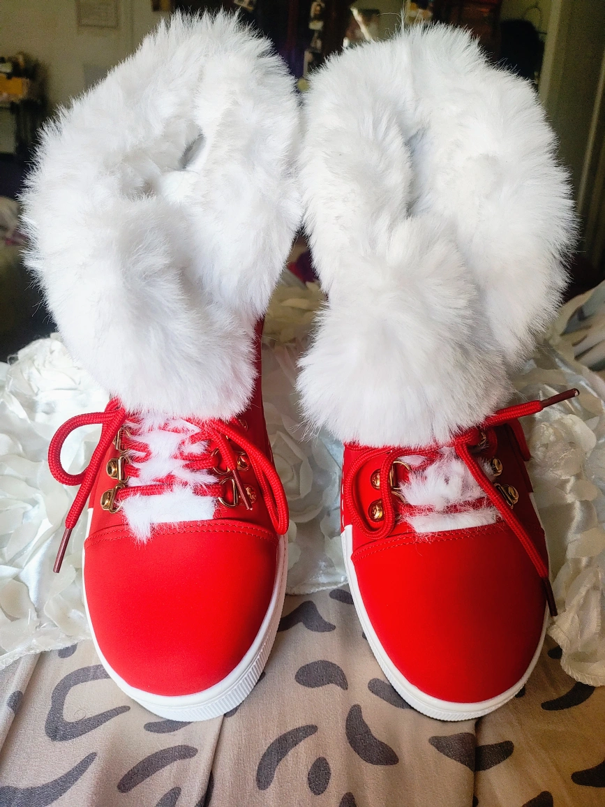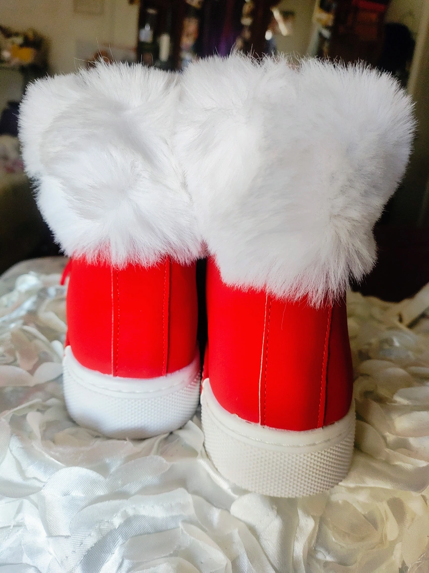 Cute red sneaker boots with fluffy white soft fur trim! The soles say EU 41, so please check the size conversion to make sure they'll fit you. Should fit Mens U.S Size 8.5 and Women's Size 10. They're in great condition and ready for a new home