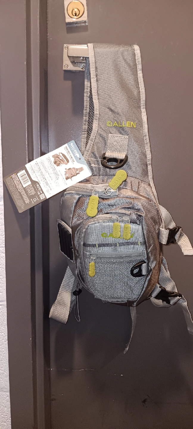 Selling a brand new Allen Cedar Creek Sling Pack! This sling pack is perfect for fishing, holding multiple fly or tackle boxes. It has a workstation with tippet tender & fly patch. Also includes D-rings for attaching accessories. Dimensions are 7in x 6in x 10.5in.