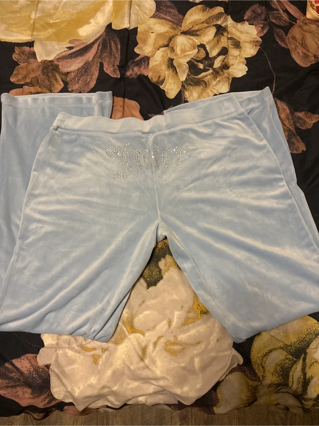 Selling a pair of light blue velour pants from Juicy Couture! They're super comfy and in good condition. The material is soft and perfect for lounging or casual wear