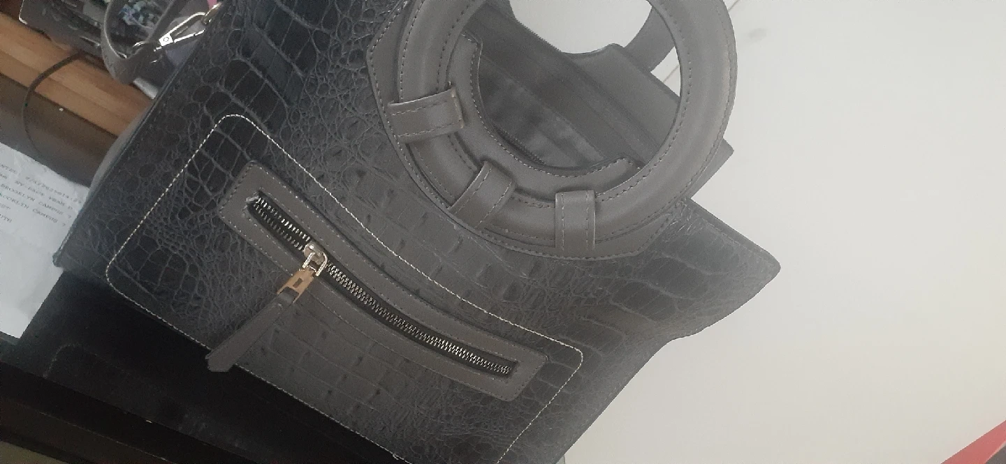 This is a stylish gray handbag with a unique crocodile pattern. It features a round handle and a zippered pocket on the front. The bag is in good condition and ready for a new home