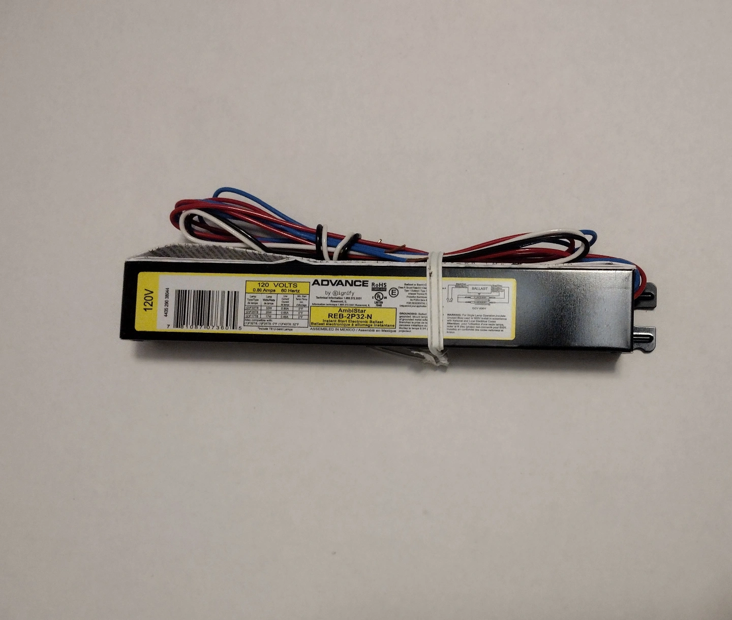 Advance REB-2P32-N instant start electronic ballast. I It operates at 120 volts and 0.80 Amps at 60 Hertz.