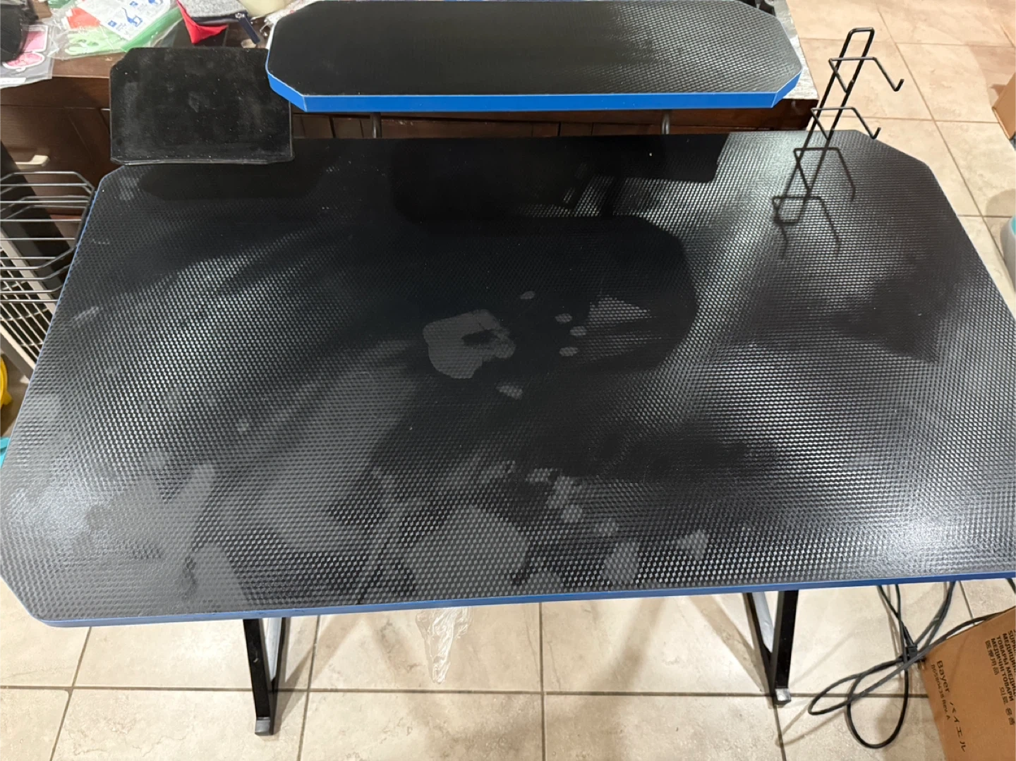 Selling a used gaming desk in black. It has a unique carbon fiber texture on the surface. Perfect for any gamer looking for a sturdy and stylish desk!