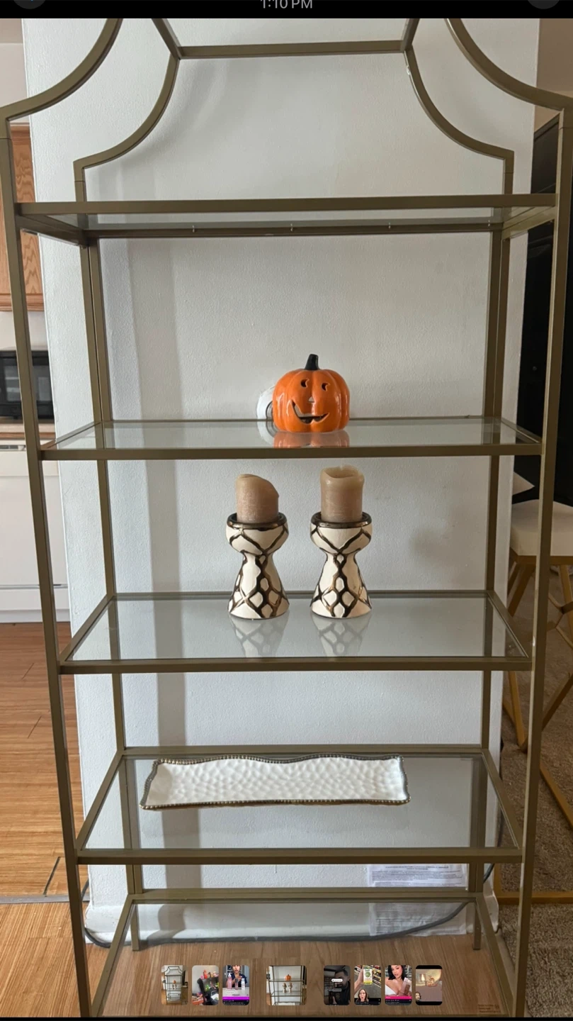 Here's a nice gold metal shelving unit with glass shelves. It's in great condition and ready for a new home! Perfect for displaying your favorite items or adding some extra storage space