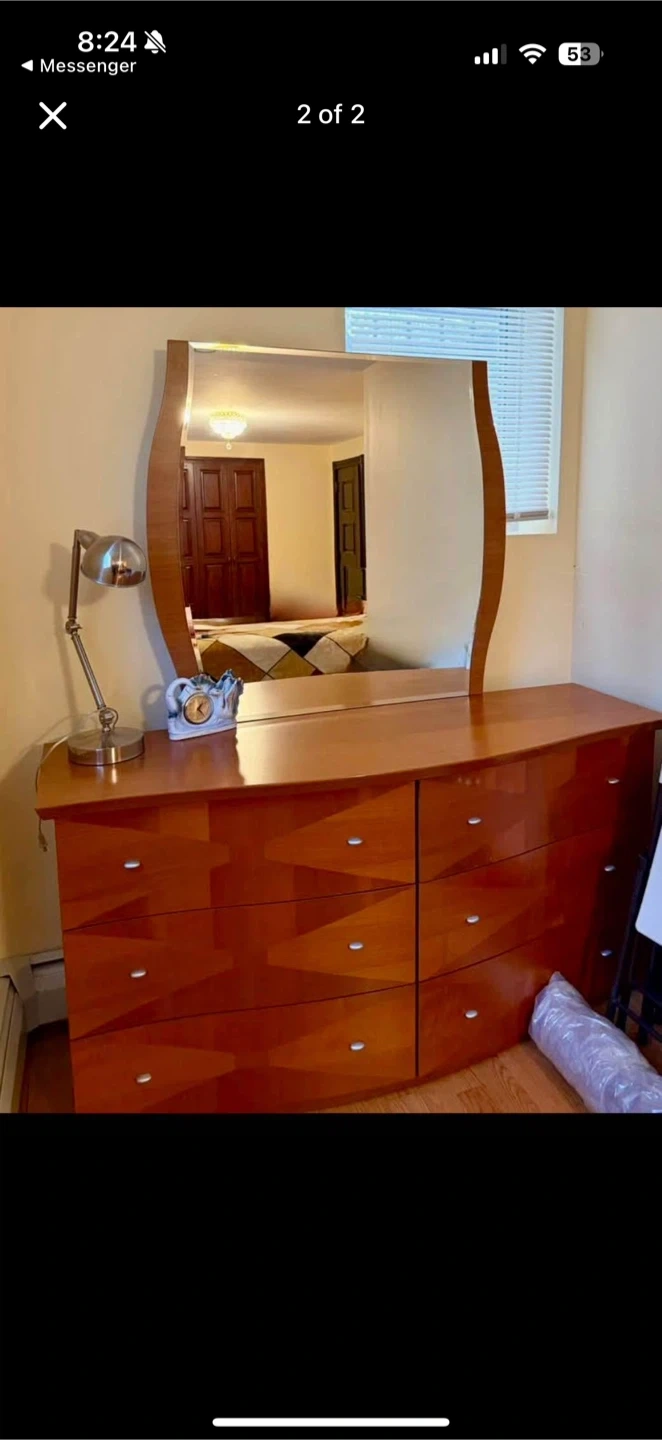 Selling a wooden dresser with an attached mirror. It features six drawers and a unique geometric pattern on the drawer fronts. The dresser is in good condition and ready to add style and storage to your bedroom