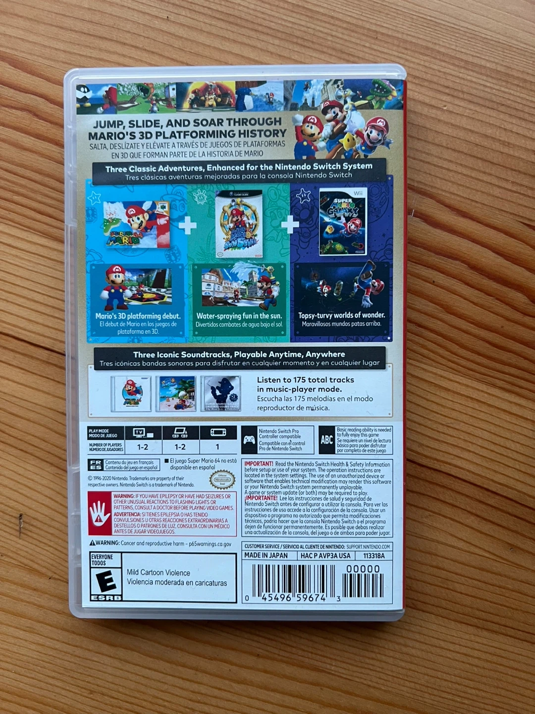 124Selling a copy of Super Mario 3D All-Stars for the Nintendo Switch! It includes three classic adventures enhanced for the Nintendo Switch System: Super Mario 64, Super Mario Sunshine, and Super Mario Galaxy