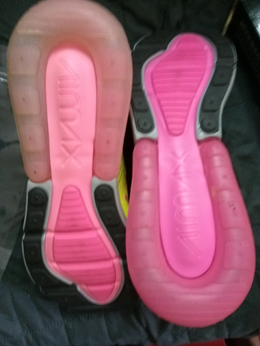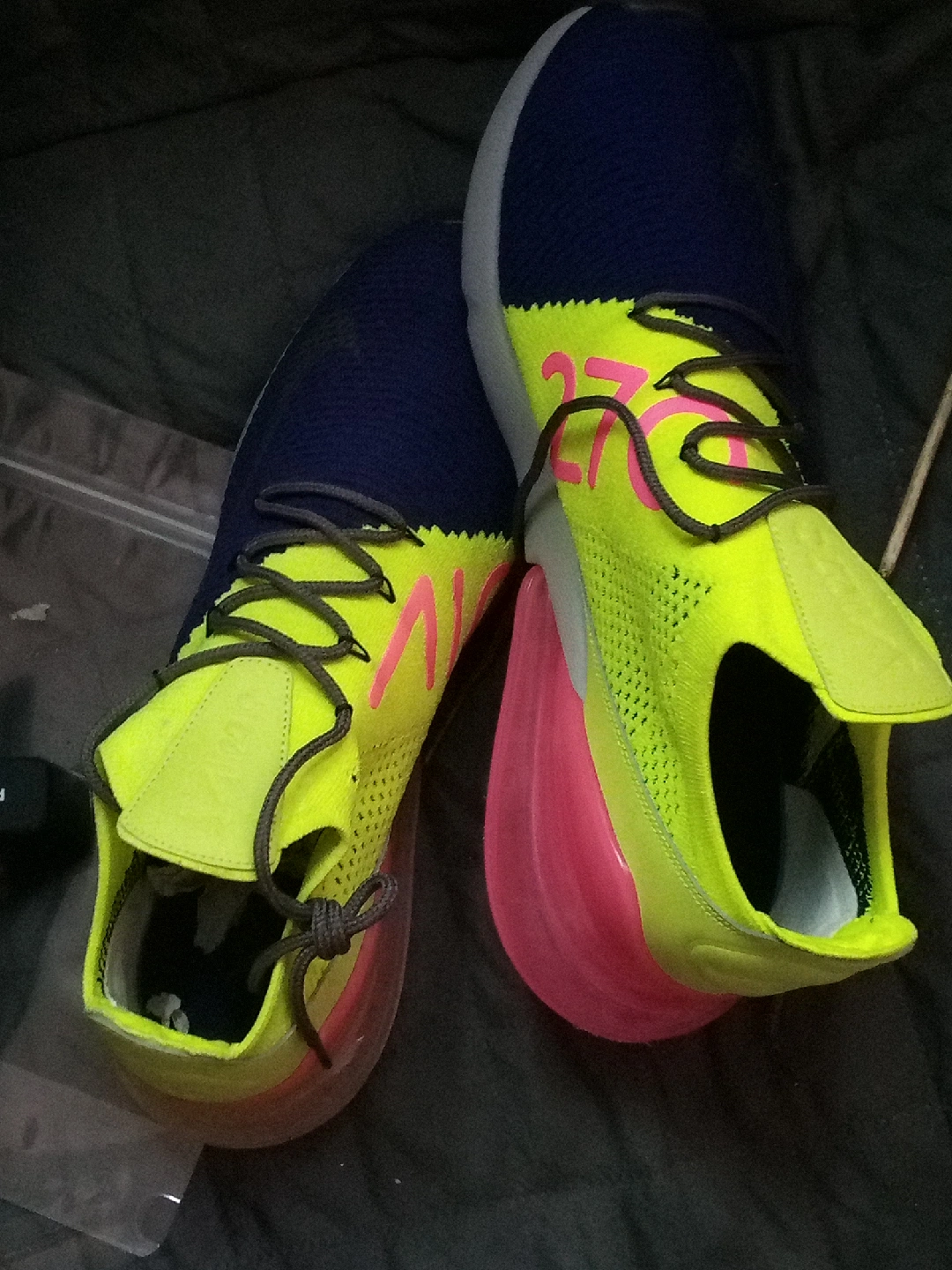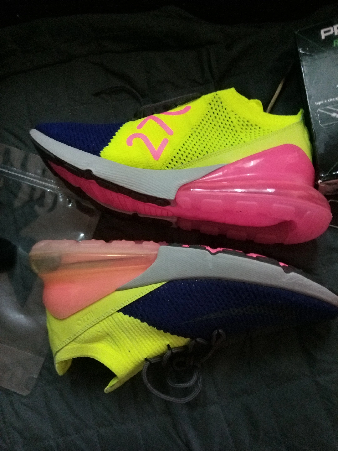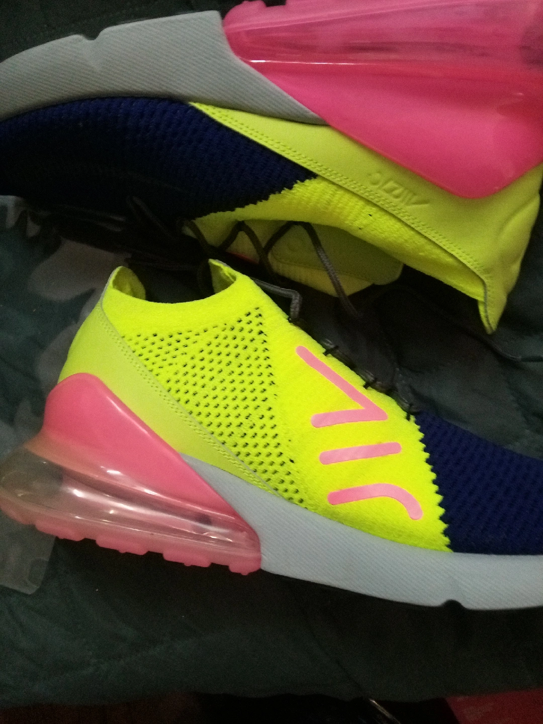 Selling a pair of Nike Air Max 270 Flyknit shoes. They have a vibrant yellow and pink color scheme with navy accents. The shoes feature the signature Air Max cushioning for comfort and a flyknit upper for a snug fit