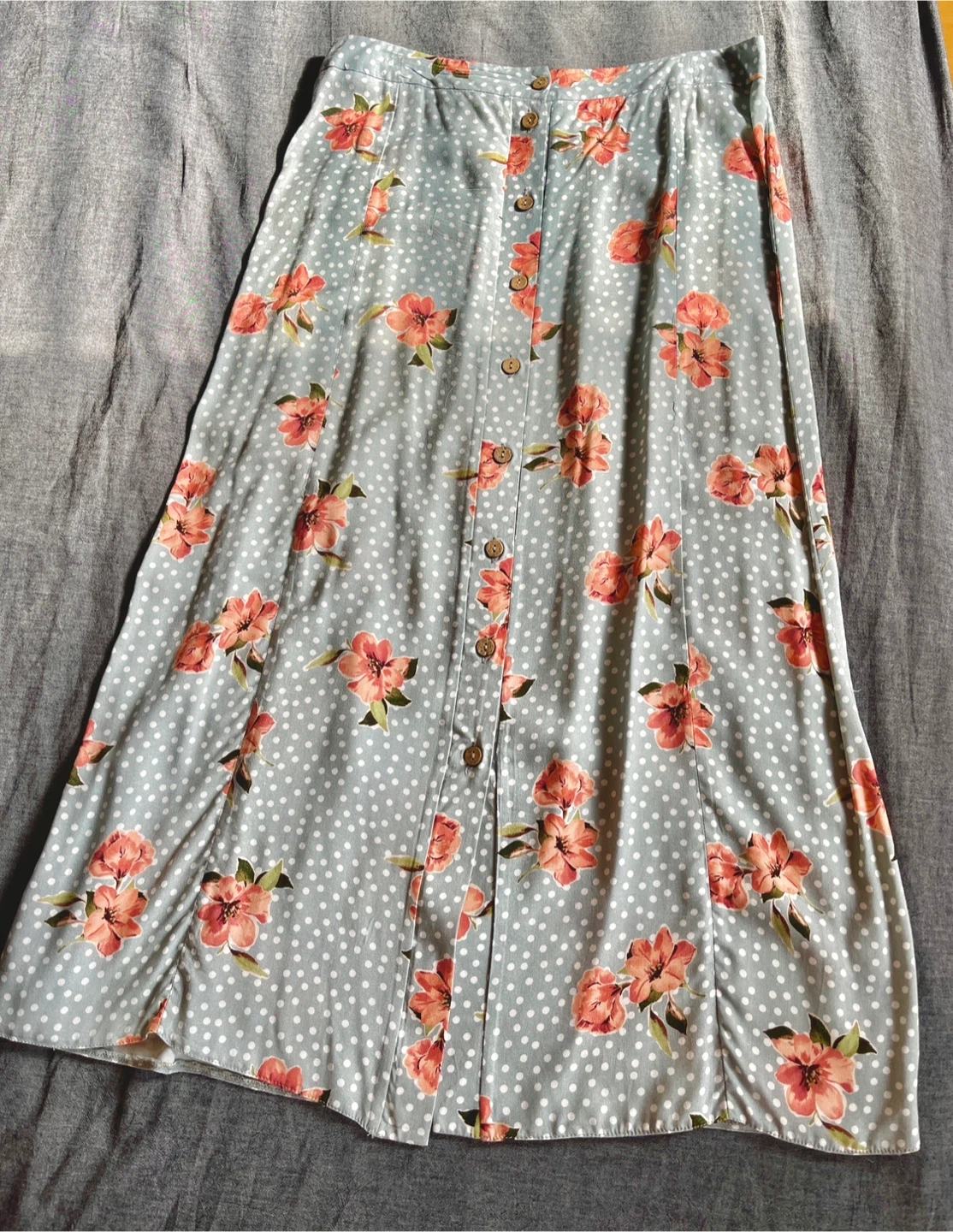 Lovely New Look midi skirt, button all the way down the front, elasticated waist, A line, floral and polka dot pattern with baby blue background