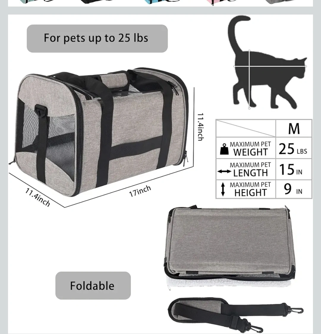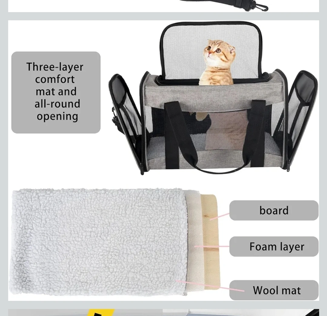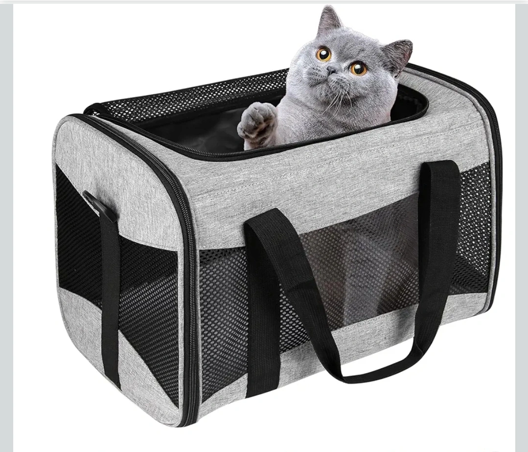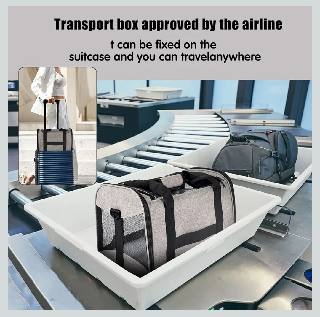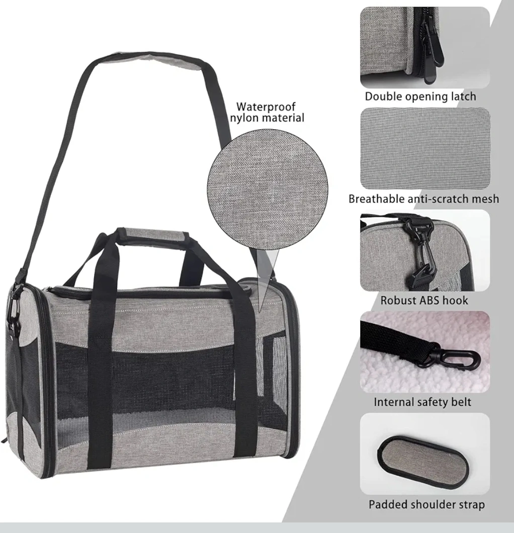 This gray pet carrier is perfect for cats or small dogs up to 25 lbs! It's airline approved, so you can travel with your furry friend. - Waterproof nylon material - Breathable anti-scratch mesh - Robust ABS hook - Internal safety belt - Padded shoulder strap - Three-layer comfort mat (board, foam layer, wool mat) - Foldable for easy storage - Size M (17 x 11.4 x 11.4 inches)
