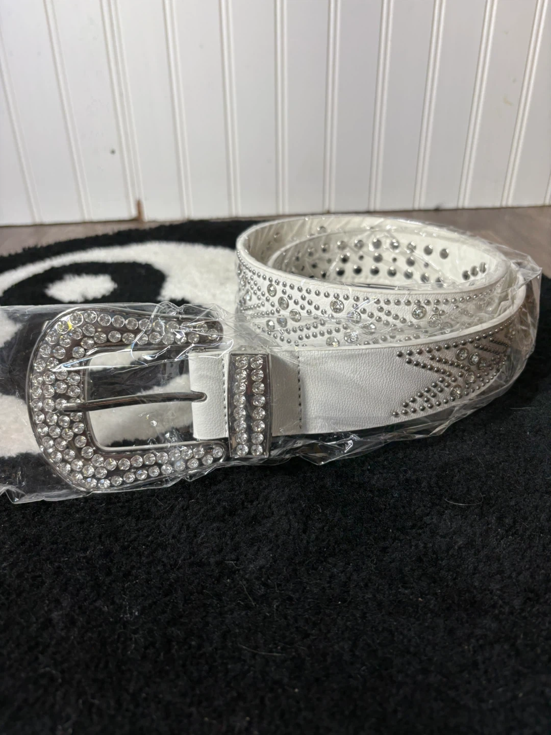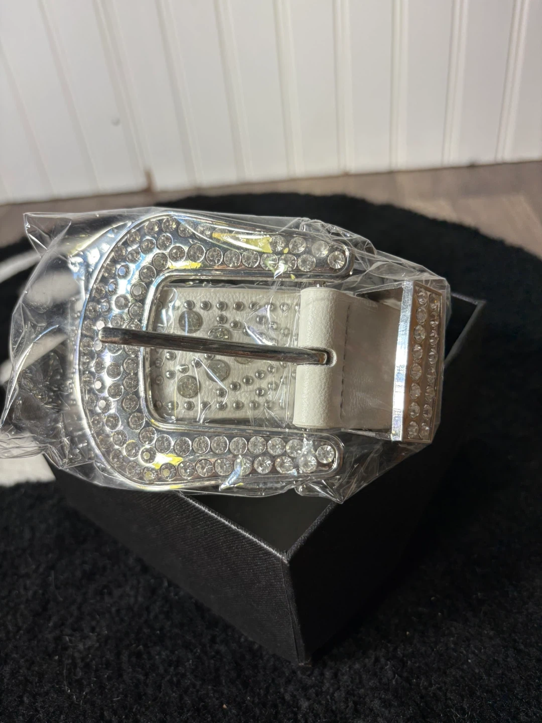 Brand new white rhinestone belt still in packaging! This belt is super stylish and will add a little sparkle to any outfit. Comes with box