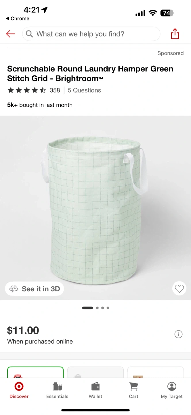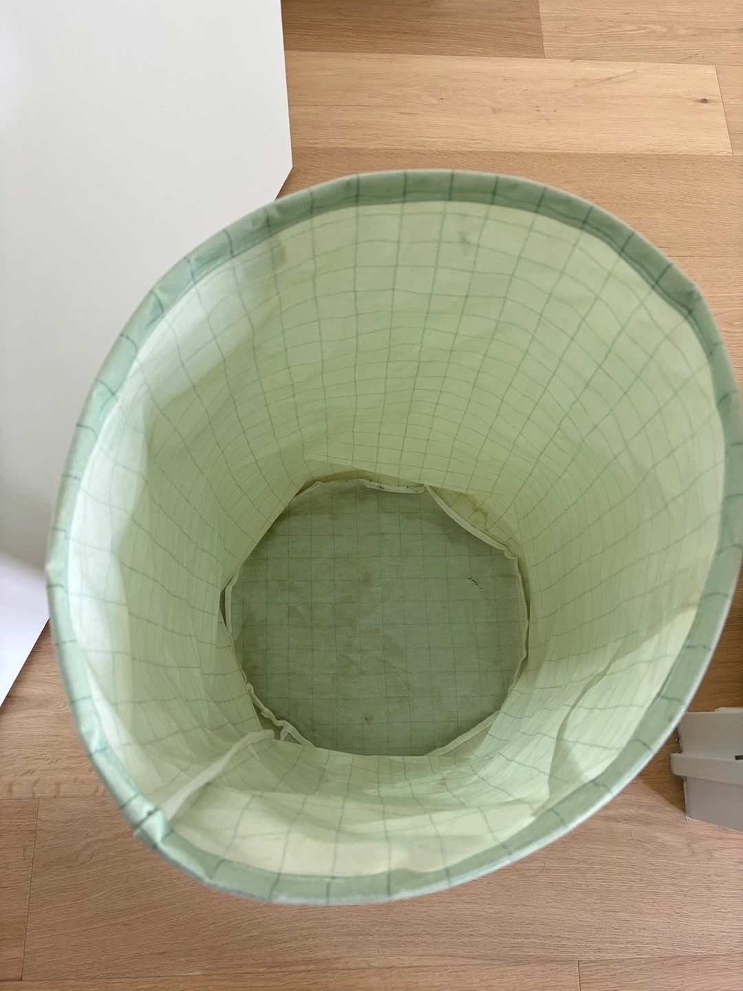 In good condition. Selling a Brightroom scrunchable round laundry hamper in a light green grid pattern. It's perfect for keeping your space tidy and organized! The hamper has convenient handles for easy carrying.