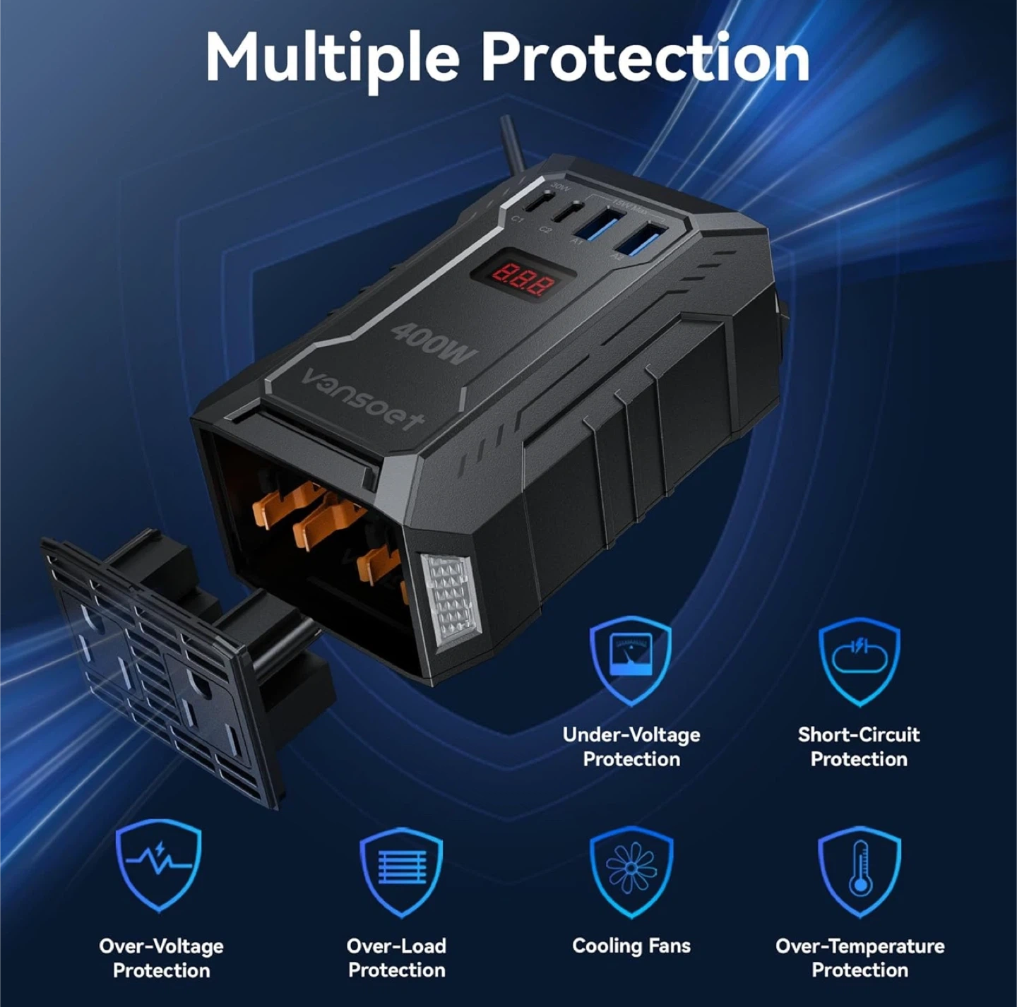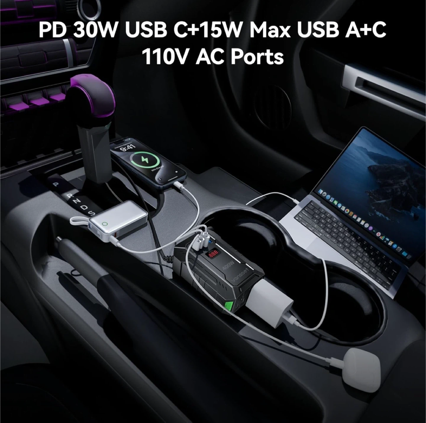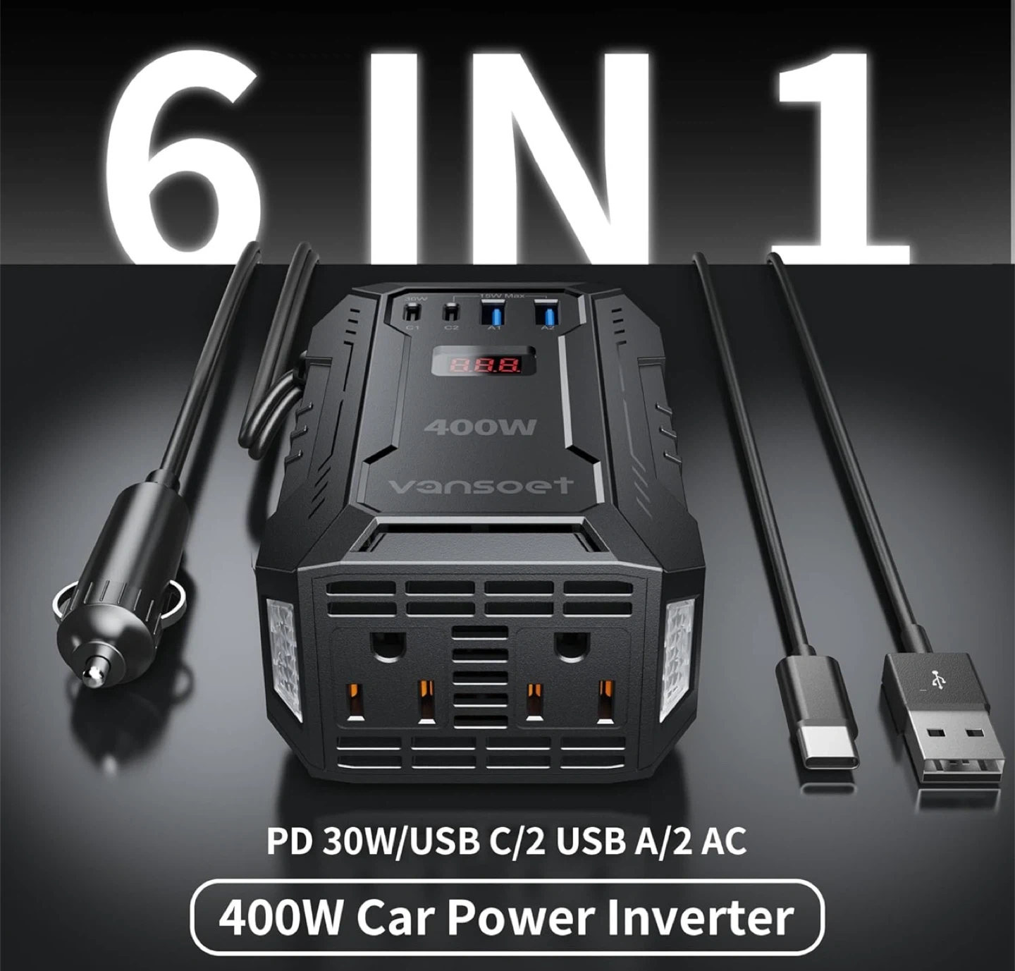 400W Car Power Inverter DC 12V to 110V AC Inverter with PD 30W/15W+2*USB A Ports & 2 AC Outlets for Laptop/Phone/Road Trip
