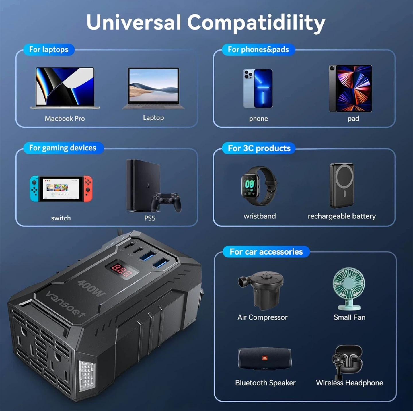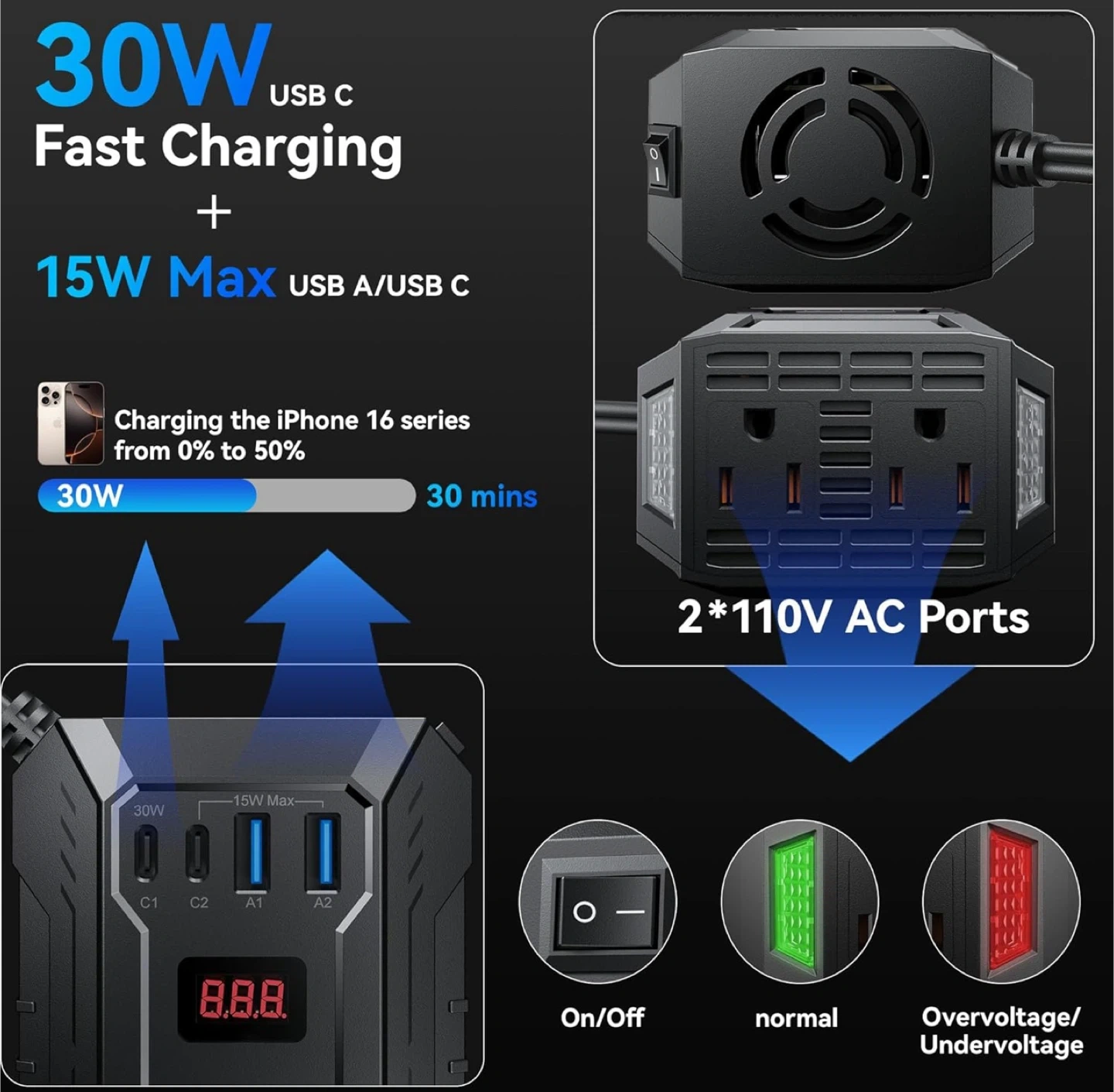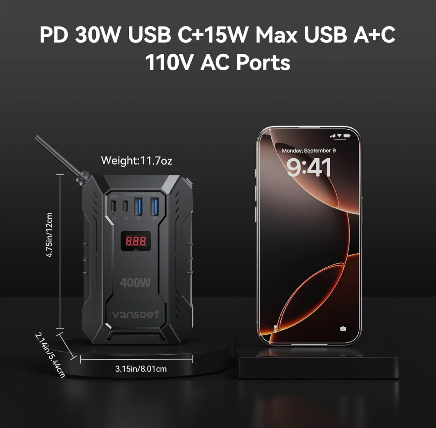400W Car Power Inverter DC 12V to 110V AC Inverter with PD 30W/15W+2*USB A Ports & 2 AC Outlets for Laptop/Phone/Road Trip