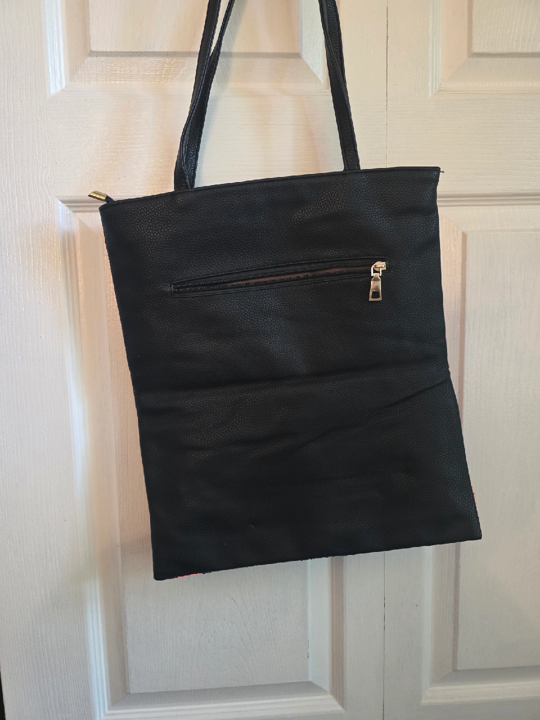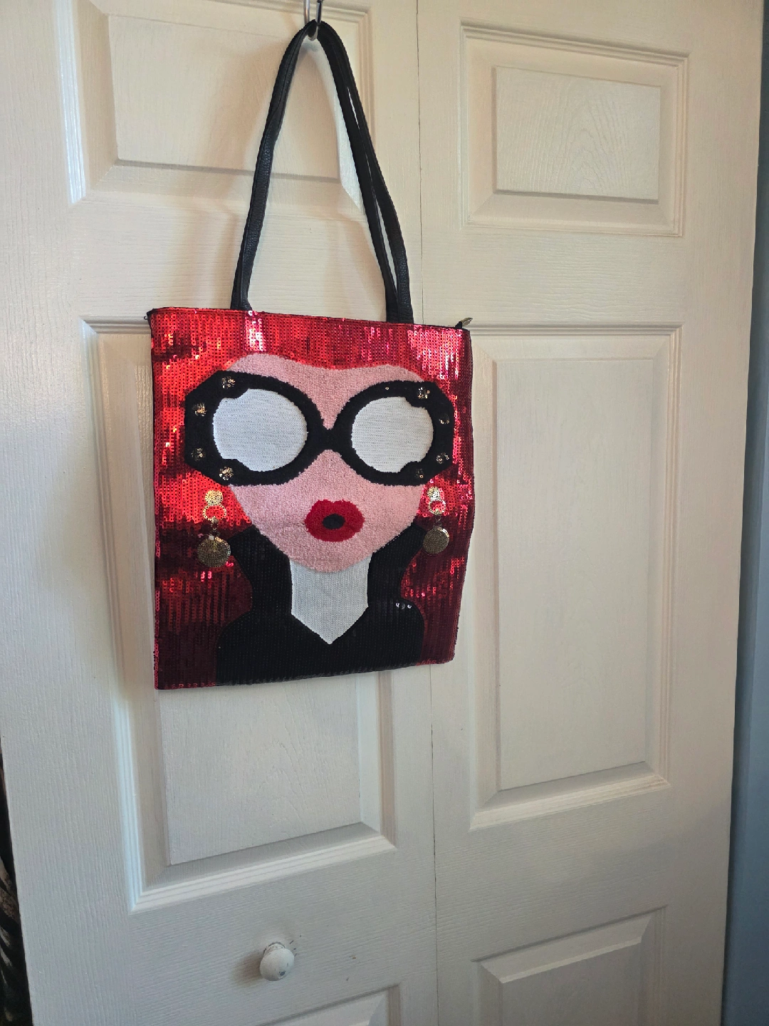 Cute tote bag with a sequin face design on the front. It's in good condition and ready for a new home! The back is plain black, and it has a zipper closure.
