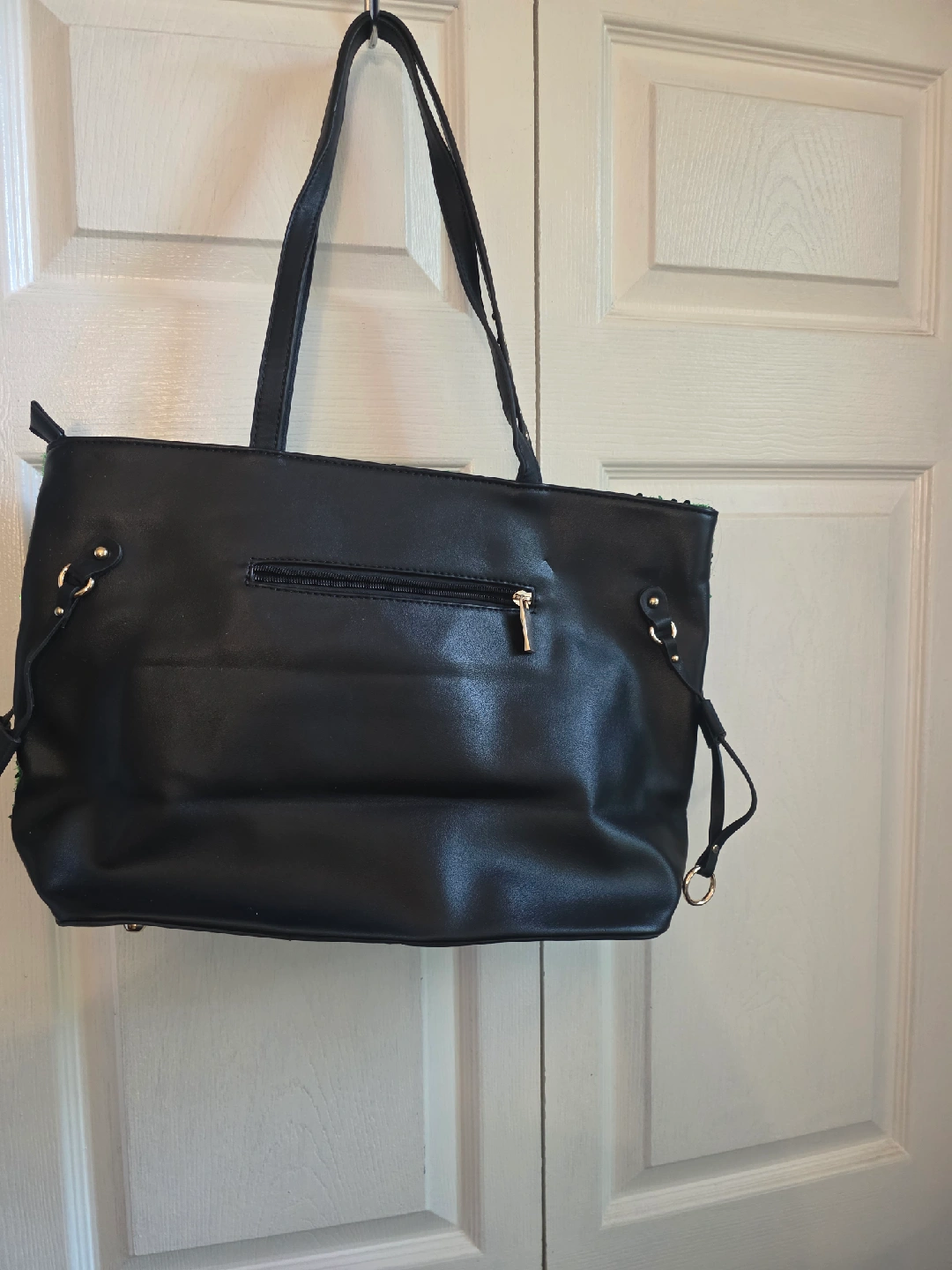 I'm selling a black tote bag. It's in good condition and ready for a new home! It has a zipper on the back and a zipper on the inside. wallet included