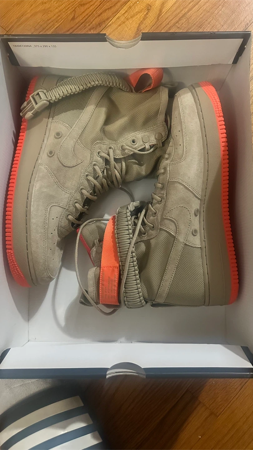 Selling a pair of Nike Air Force 1 High coral They come in a tan/khaki color with an orange sole. Comes with a replacement box