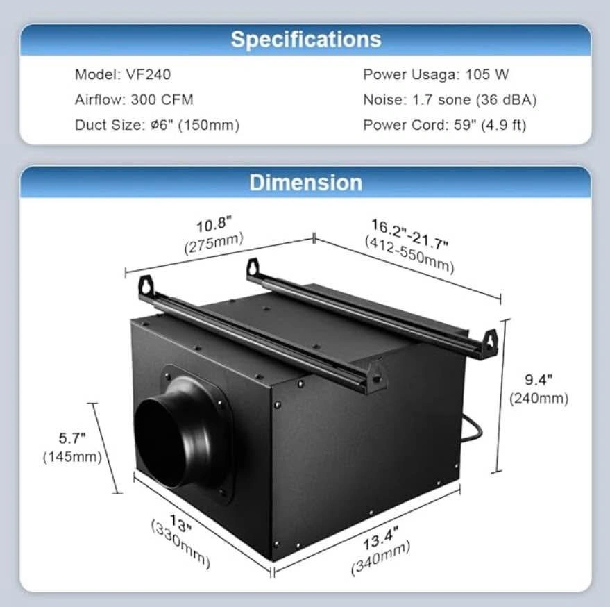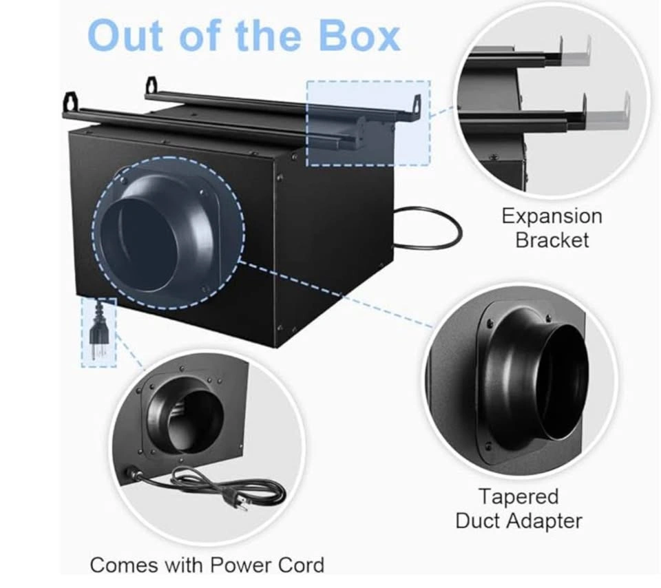 Midcvfrun inline bathroom exhaust fan equipped with 2 level of air volume, you could choose the desired air volume by switch the button at the bottom of the fan, perfectly balanced the noise between the air volume. With high level 200CFM 1.5 Sones and Low Level 130CFM 1.2 Sones This 2025 new ventilation fan is specially designed for for high performance exhaust. It is typically installed in an attic or roof space to ventilate one or more rooms, stronger air circulation, eliminating winter condensation on walls This unit is installed away from the living space, so the only sound you hear in your living space is a gentle airflow. Adopts centrifugal blower, which features lower noise, lower energy consumption and requires no maintenance Comes with mounting bracket, expansion bracket and tapered duct adapter, makes the installation flexible and easy enough. Widely applied in different scenarios like bathrooms, garages, and kitchens to enhancing comfort Specifications - Air volume-H: 200CFM Noise-H: 1.5 Sone | Air volume-L: 130CFM Noise-L: 1.2 Sone | Dimension: 13.5 x 13 x 9.5 in | Material: galvanized steel | Power Cord: 5ft | Warranty: 3 year | Ducting Opening: 4 inch