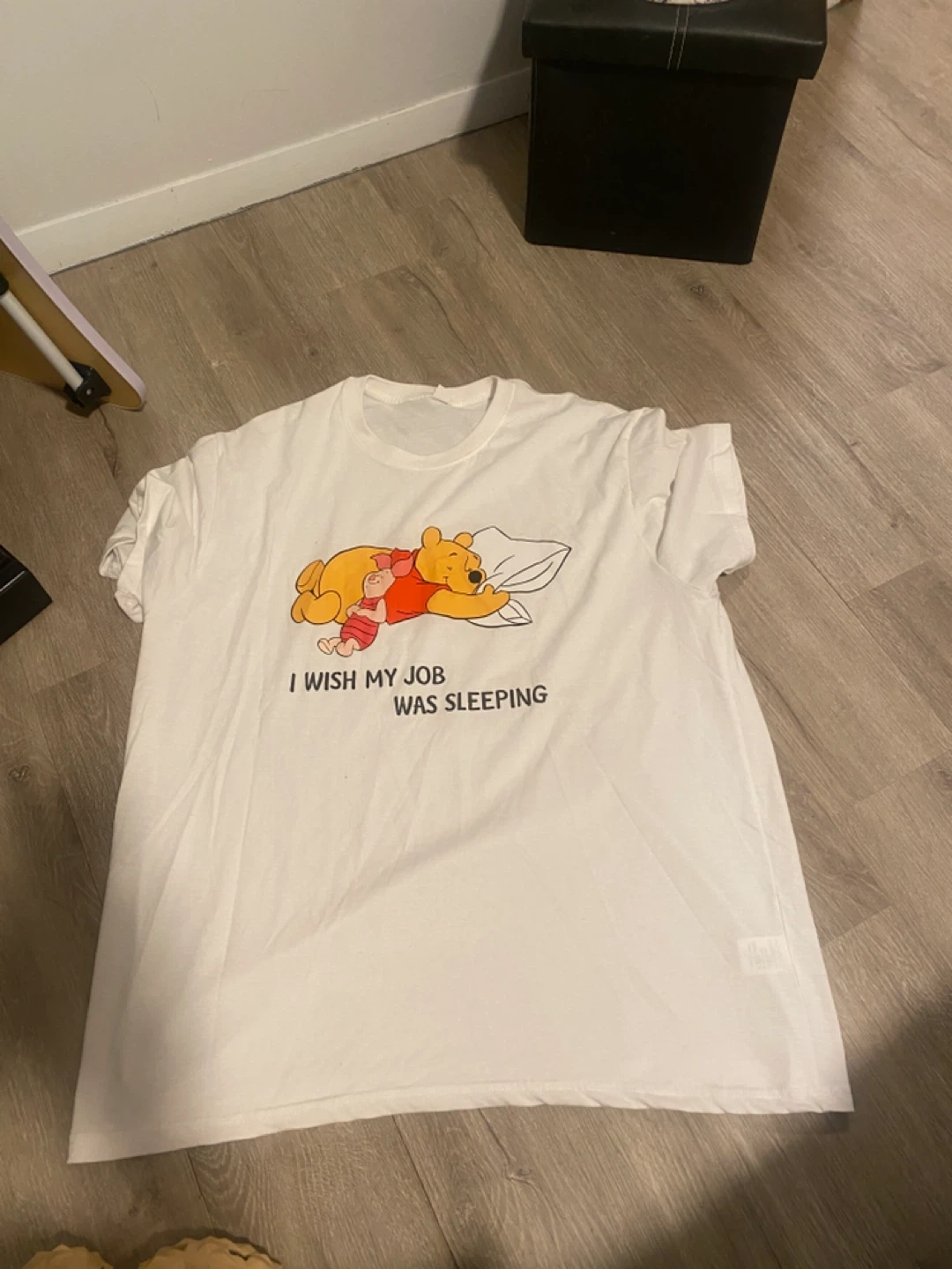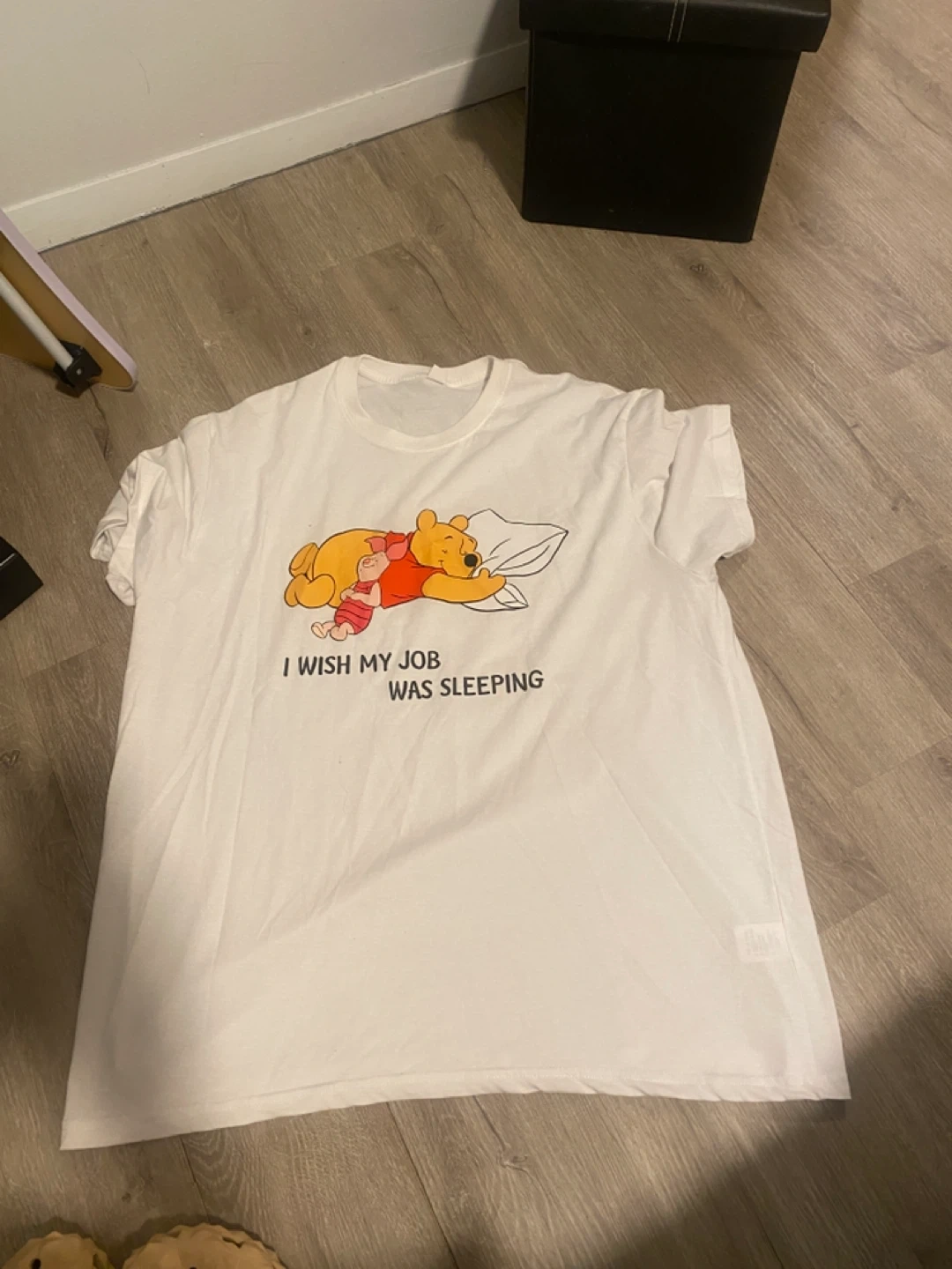 70Selling a cute Winnie the Pooh T-shirt with the phrase 'I wish my job was sleeping' printed on it! It's white and features Pooh and Piglet taking a nap. Perfect for casual wear! Pick up in Bensonhurst bklyn Screen print Size xl Text 347-366-4713