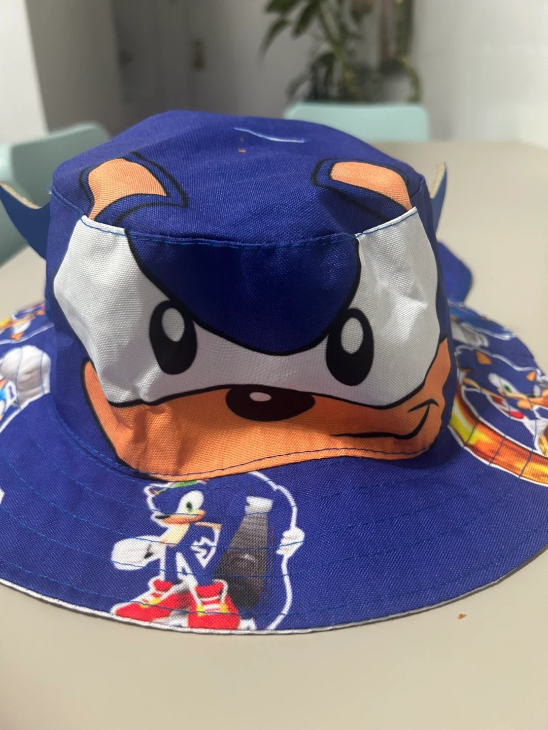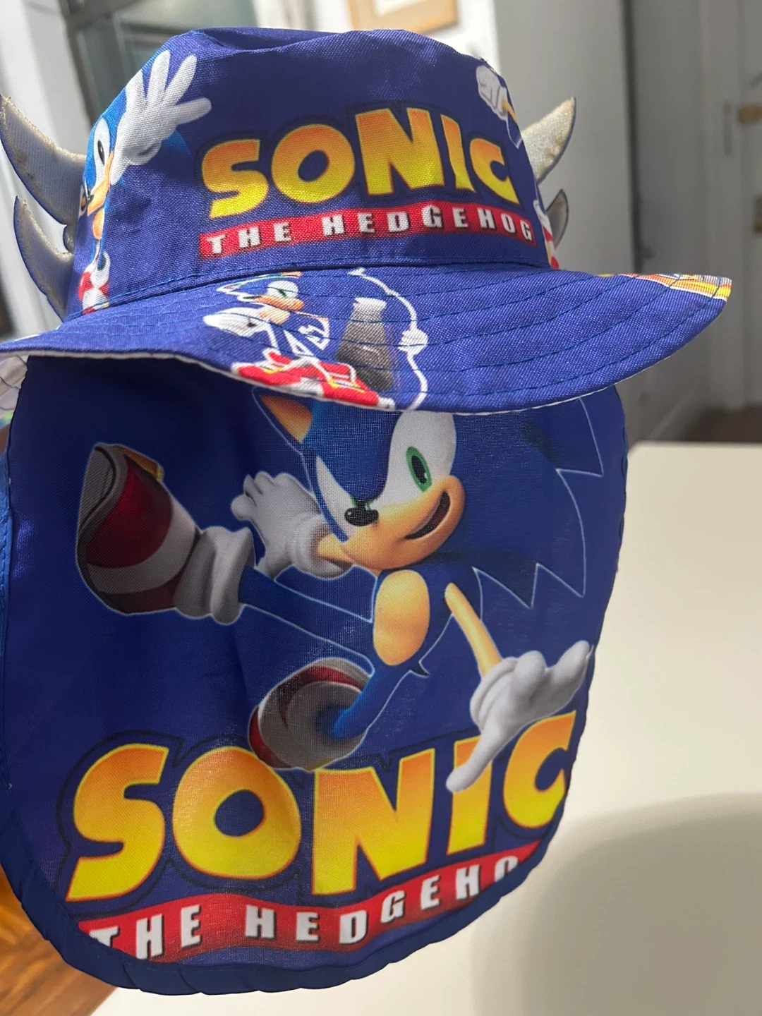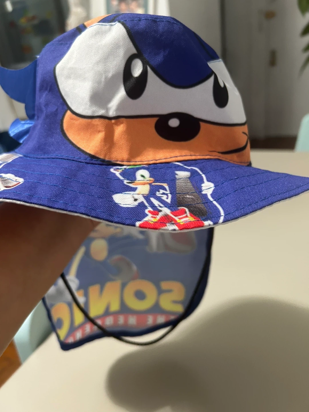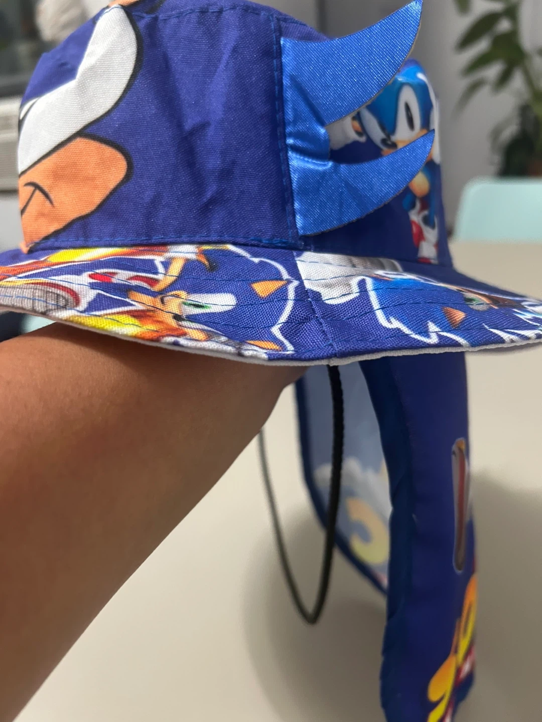 A fun blue bucket hat featuring Sonic the Hedgehog! Perfect for keeping the sun off your little one's face. It has a neck cover for extra sun protection, too