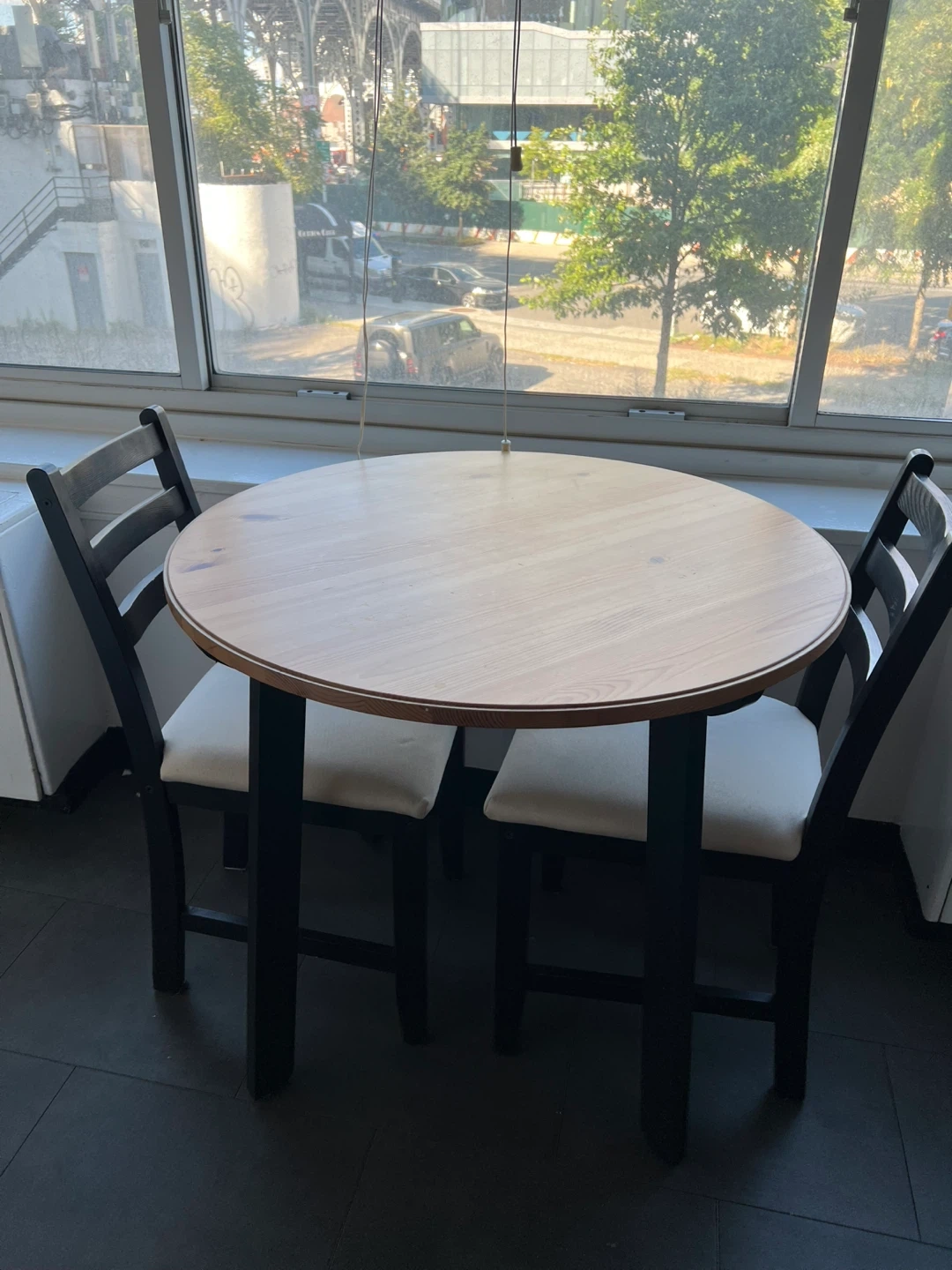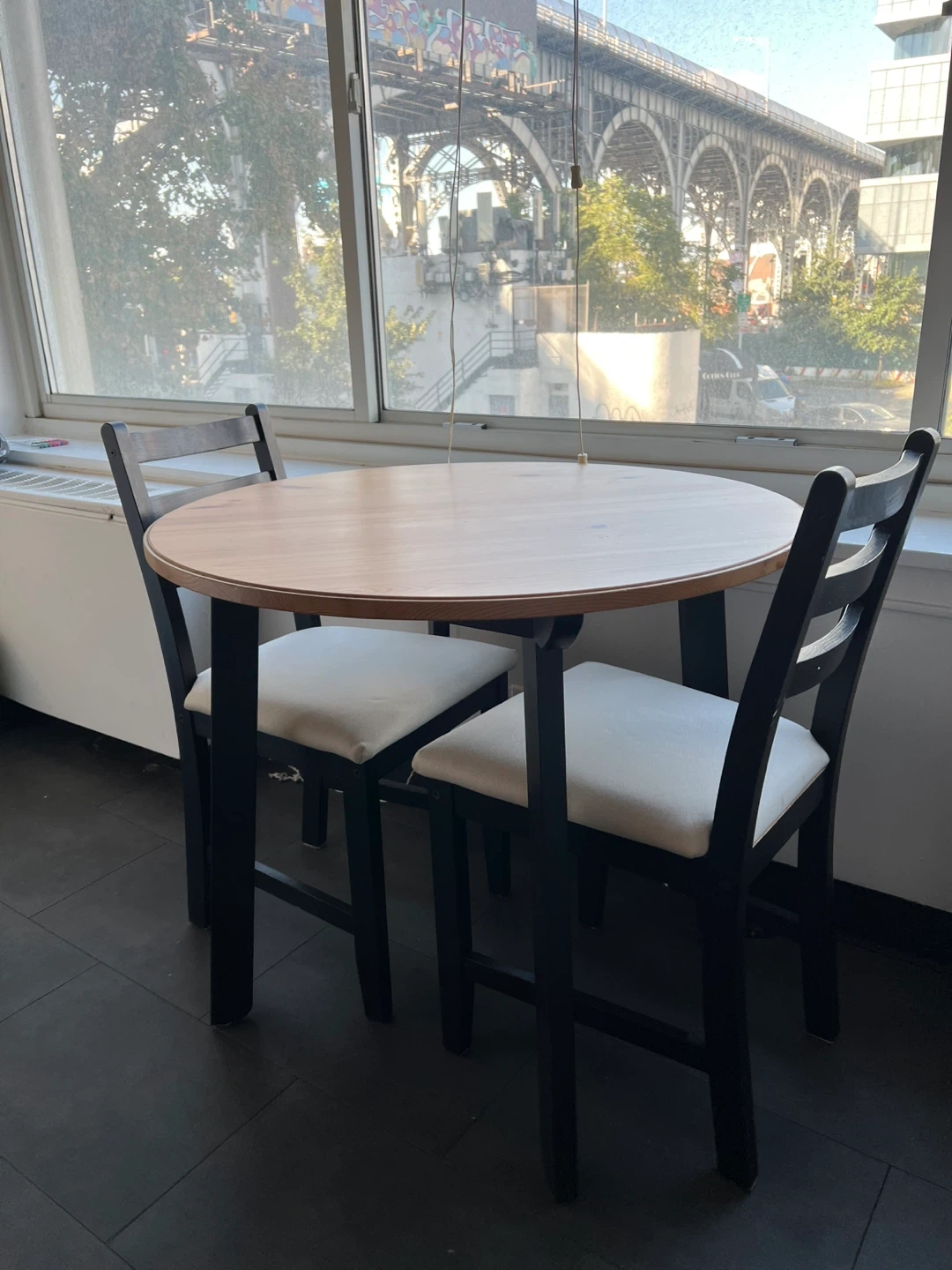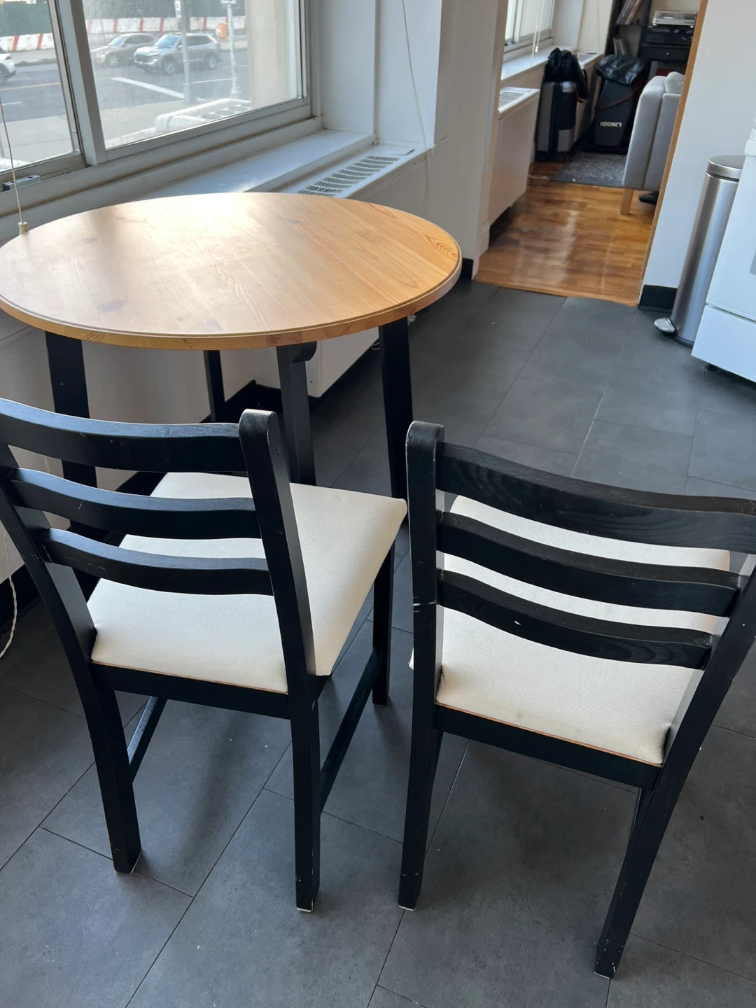 124Selling a round wooden dining table with two matching chairs. The table has a light wood top and black legs. The chairs have black frames and light-colored cushioned seats. It's a great set for a small dining area or kitchen! MOVING OUT SALE CASH ONLY PICKUP ONLY