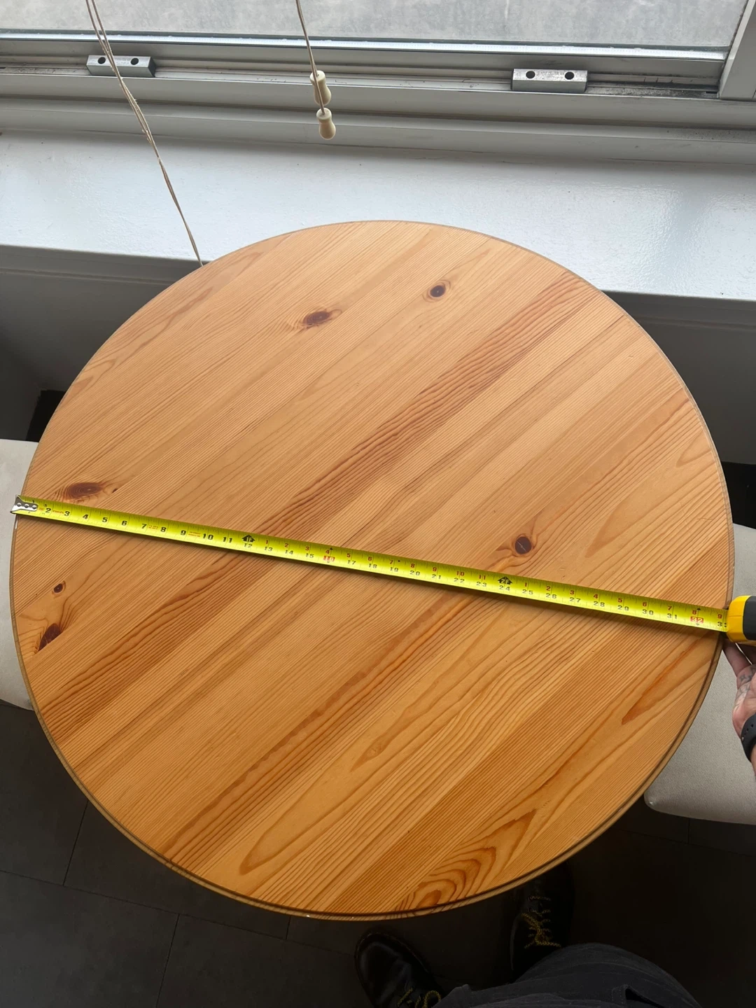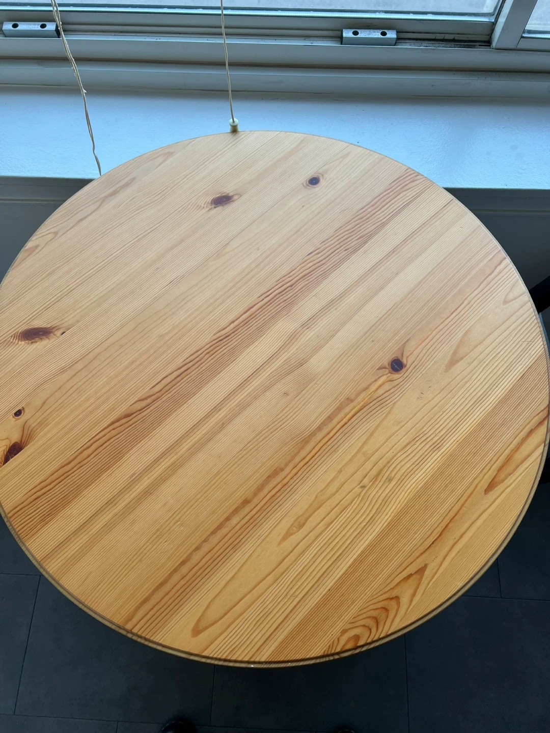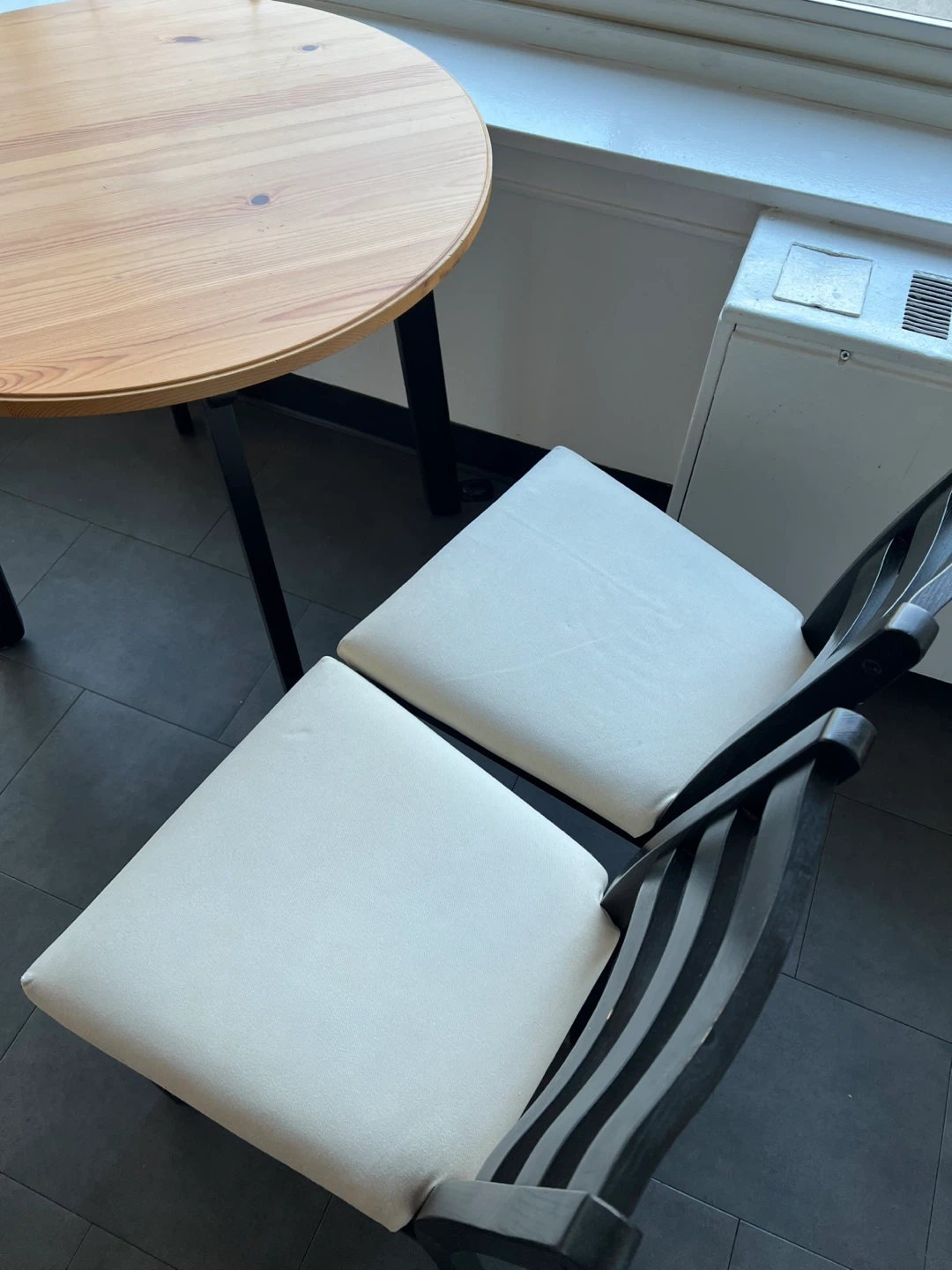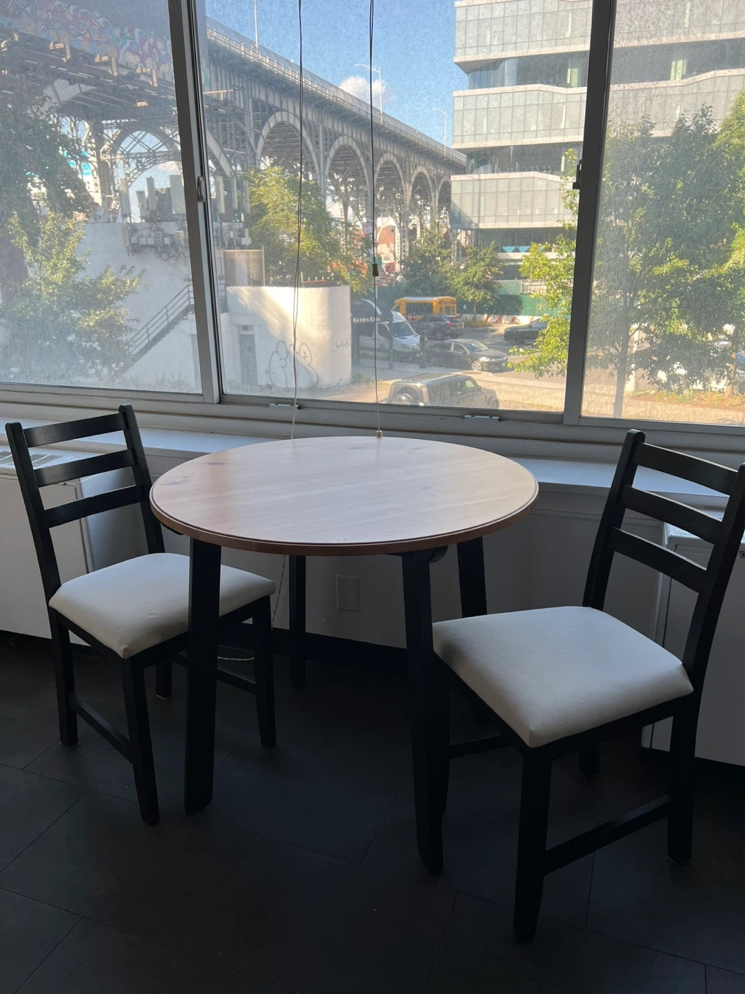 124Selling a round wooden dining table with two matching chairs. The table has a light wood top and black legs. The chairs have black frames and light-colored cushioned seats. It's a great set for a small dining area or kitchen! MOVING OUT SALE CASH ONLY PICKUP ONLY
