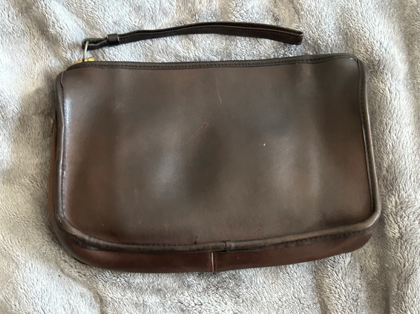 Selling a Coach brown leather wristlet. It's in good condition with some signs of wear. It's a great accessory for carrying your essentials!