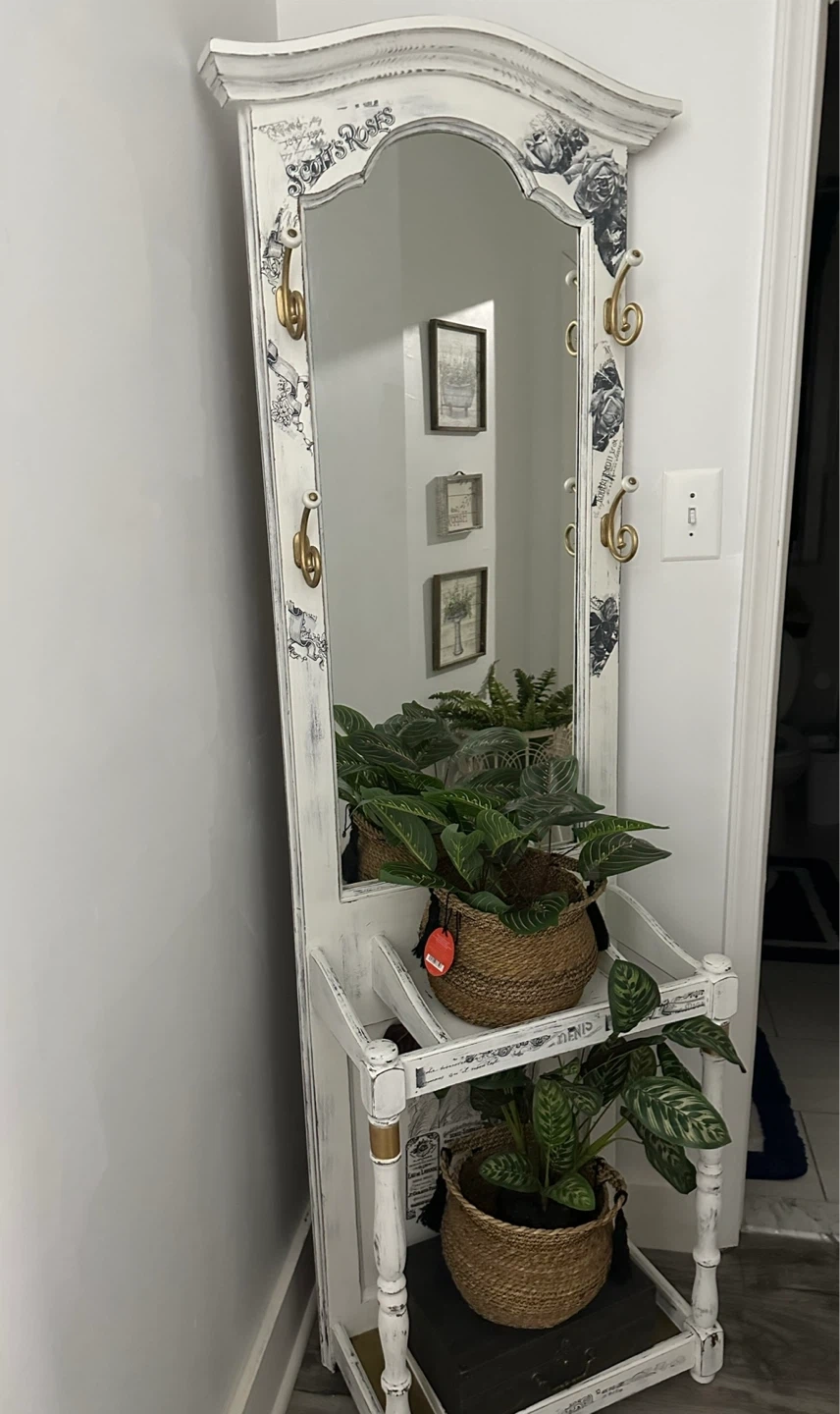 Selling a charming hall tree with a built-in mirror and storage shelves. It features a distressed white finish with decorative floral accents. Perfect for adding a touch of vintage style to your entryway or hallway!